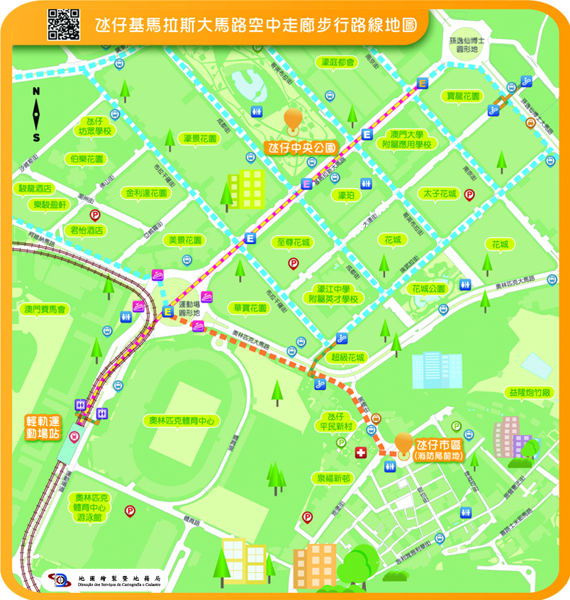 因應本澳步行系統及行人過路設施的不斷完善,以及氹仔基馬拉斯大馬路空中走廊正式使用,地圖繪製暨地籍局與交通事務局、土地工務運輸局、市政署及文化局合作推出更新版步行路線地圖及專題網頁,方便市民進一步瞭解本澳步行系統及設施的最新現況,滿足市民的使用需求。