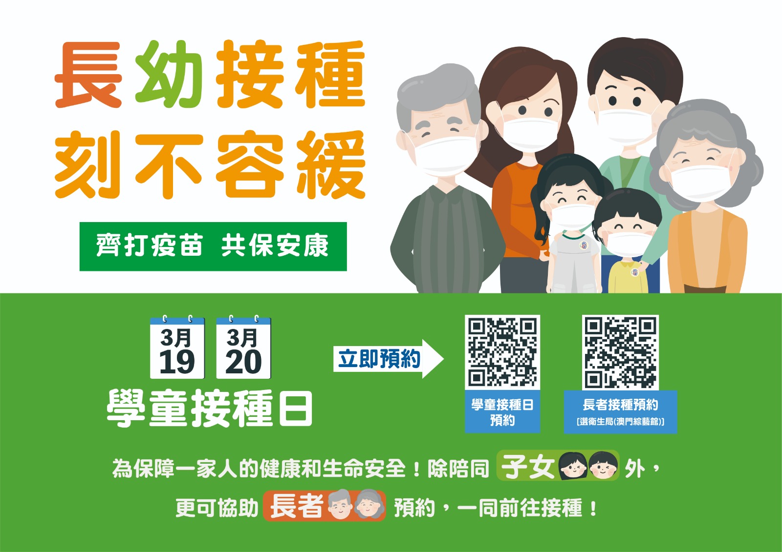 為推動和便利家長儘快陪同3歲或以上的子女及長者利用周末時間接種新冠疫苗,教青局與衛生局繼續於本周六及日(3月19日及20日)早上9時至傍晚6時於綜藝館社區大型疫苗接種站進行“學童接種日”,家長可掃描圖文包中的二維碼進行預約。