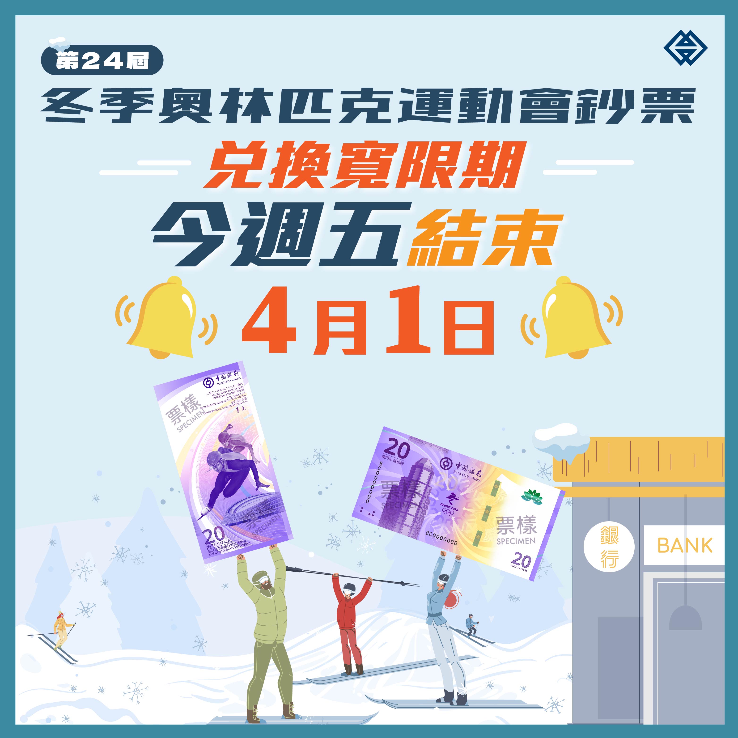 第24屆冬季奧林匹克運動會鈔票的兌換寬限期將於2022年4月1日(星期五)結束。澳門金融管理局呼籲,已完成網上登記但尚未辦理兌換的人士,請於寬限期屆滿前到所選定的銀行網點進行兌換。