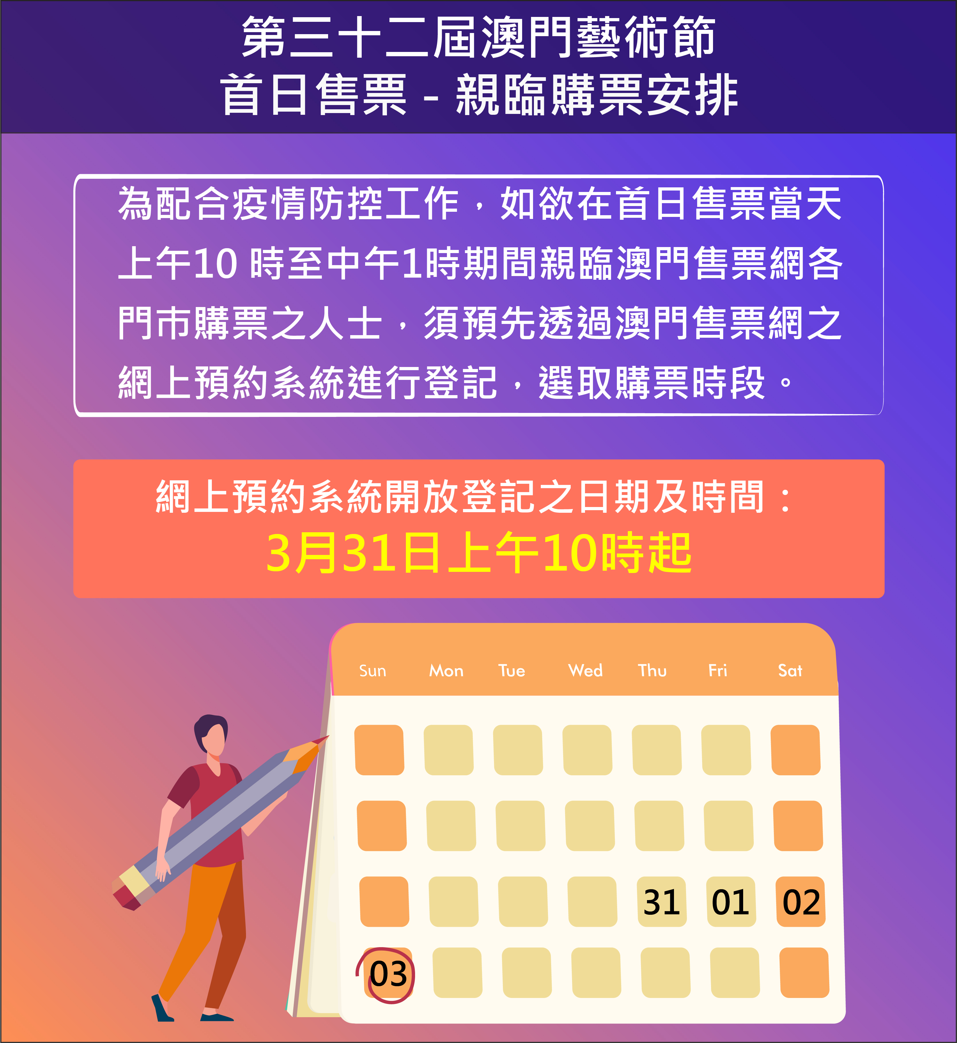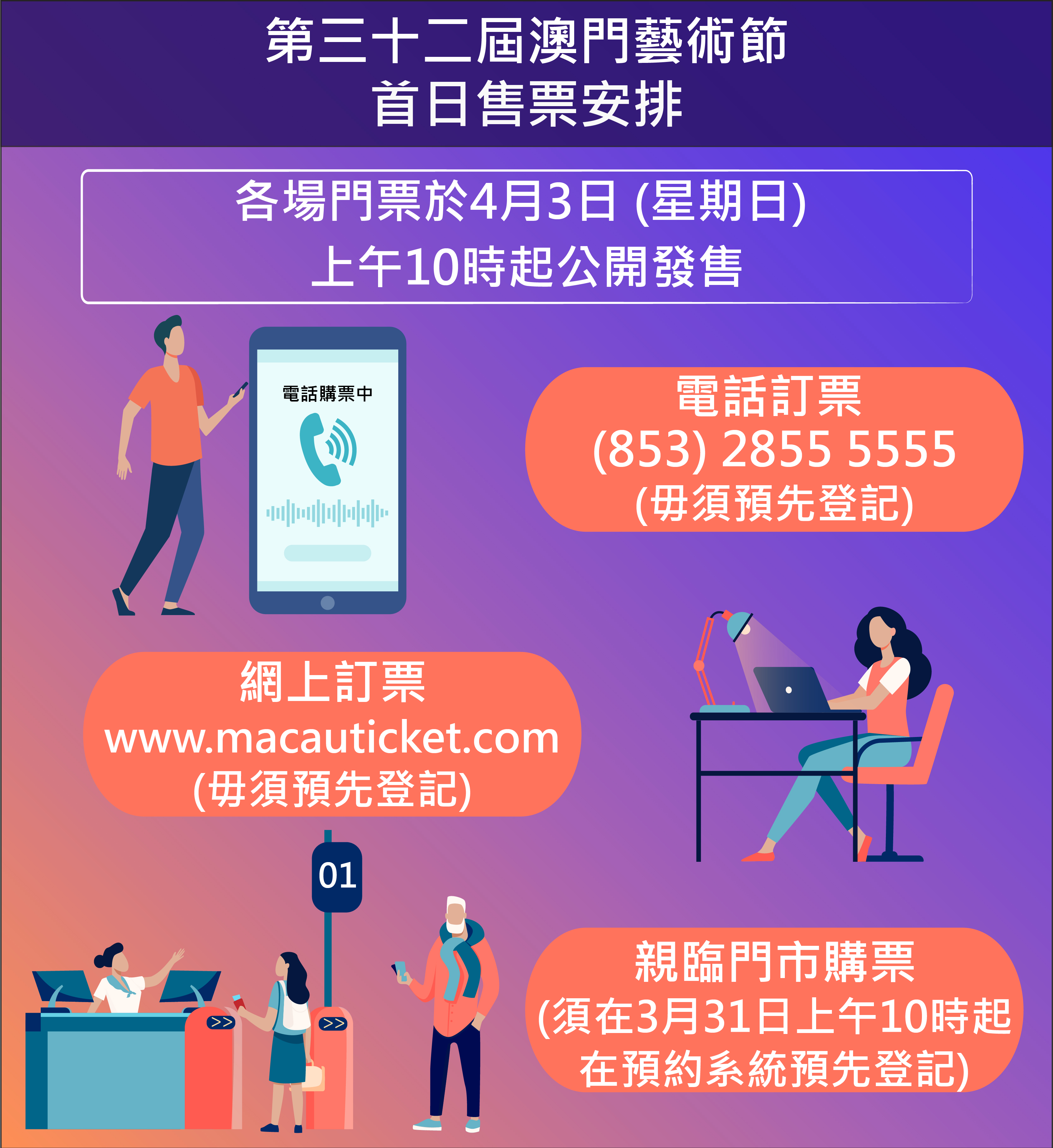 由文化局主辦的第三十二屆澳門藝術節將於4月29日至6月2日舉行,各場節目及部份延伸活動門票於4月3日(星期日)上午10時在澳門售票網公開發售。為做好疫情防控工作,保障市民的健康,首日售票當日門市購票、電話及網上訂票服務將同步開通。為減少購票現場人流聚集,呼籲市民透過網上及電話進行購票;同時特設首日售票網上預約系統,市民須於3月31日(星期四)上午10時起預先透過系統進行登記及預約購票時段,方可在首日售票上午10時至下午1時親臨澳門售票網門市購票。