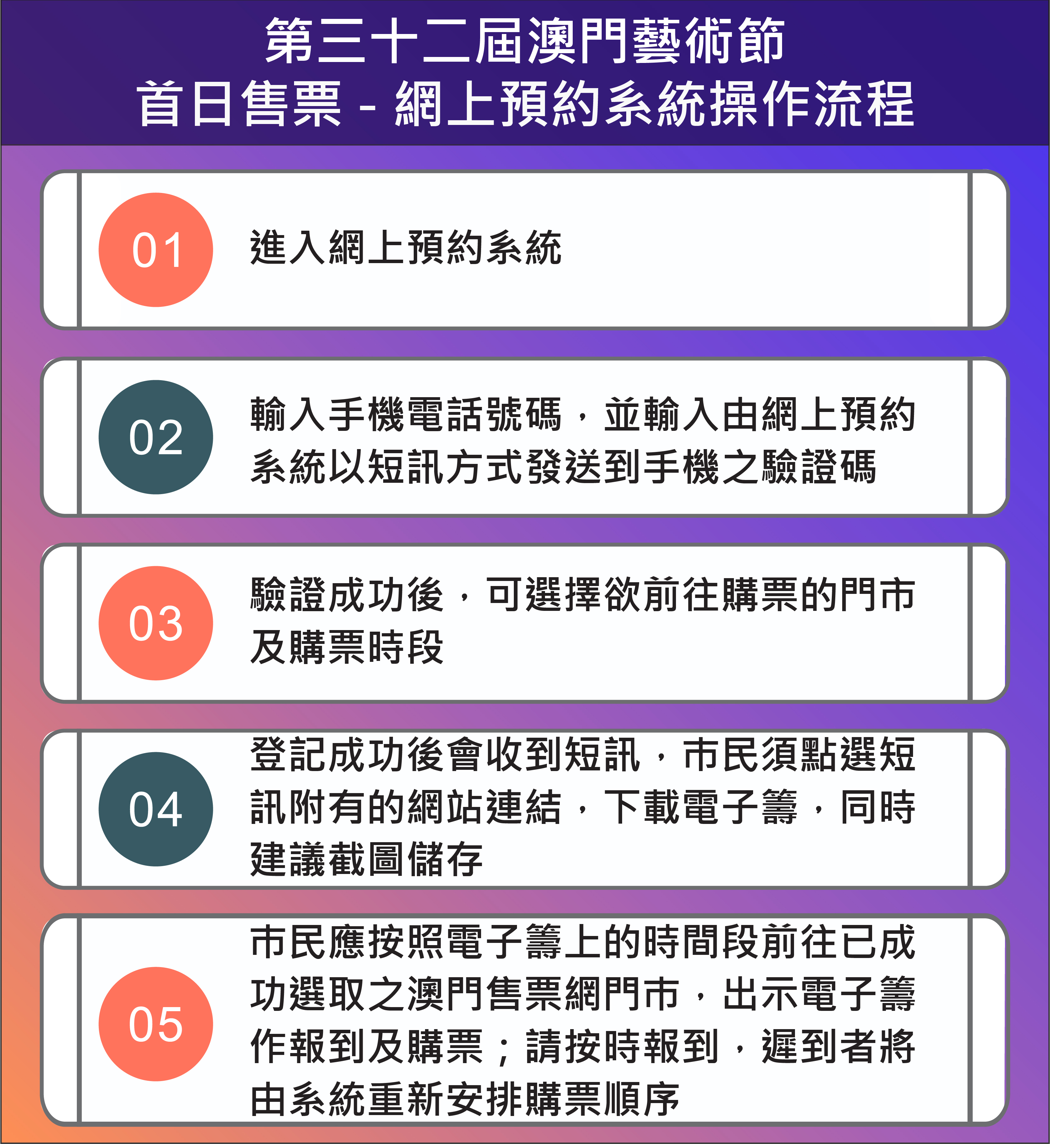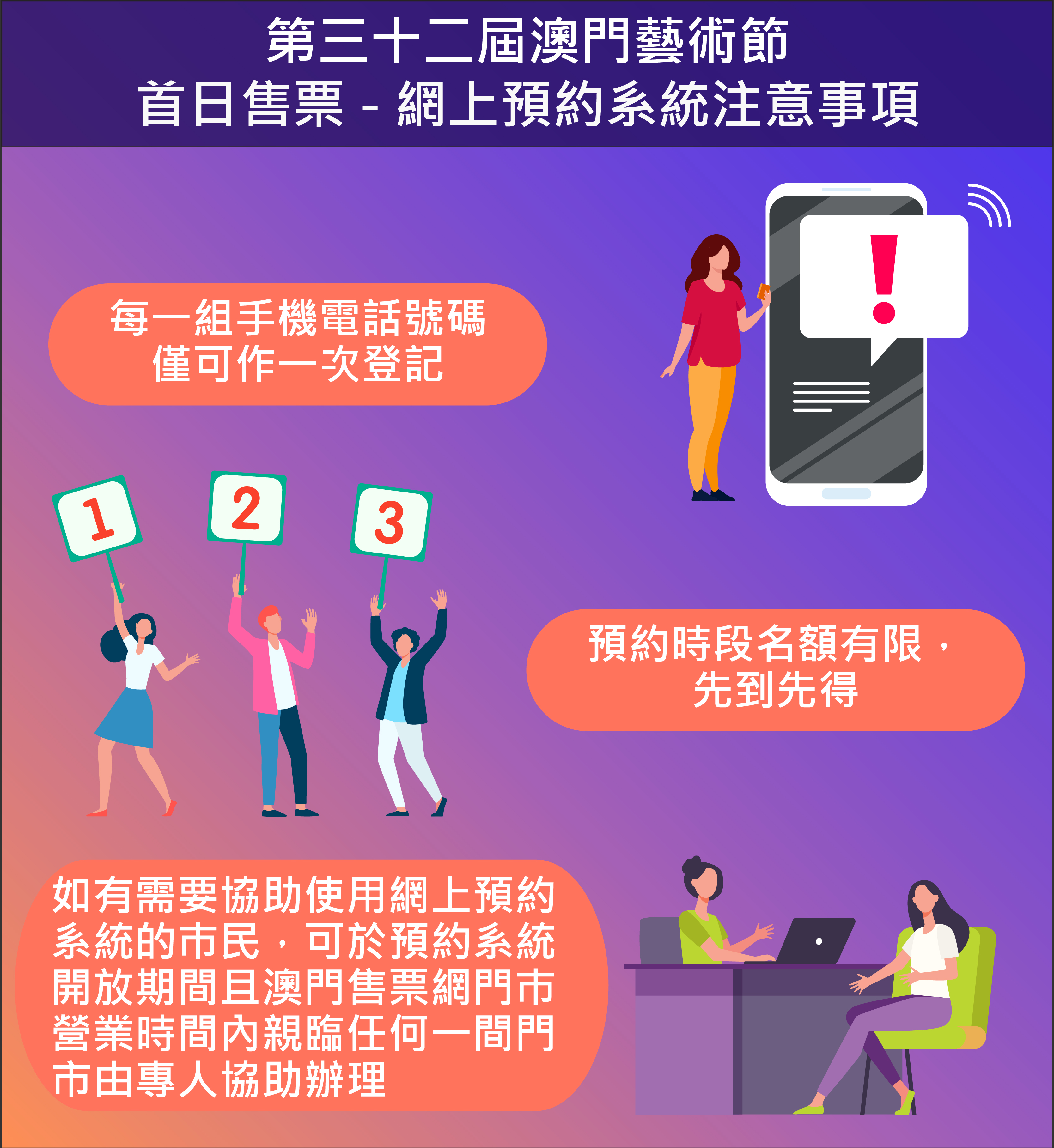 為配合疫情防控工作,優化澳門藝術節購票安排,進一步鼓勵市民享用電子政務的便利性,文化局於首日售票同步開通現場及電子多元購票模式,同時特設首日售票網上預約系統,觀眾如選擇在首日售票當日上午10時至下午1時親臨澳門售票網門市購票,須於3月31日(星期四)上午10時起,透過系統憑手機電話號碼預約購票時段,成功預約者方可按時段前往自選門市購票。有需要協助使用網上預約系統的市民,亦可於預約系統開放期間且澳門售票網門市營業時間內親臨任何一間澳門售票網門市由專人協助辦理。預約時段名額有限,先到先得,每一組手機電話號碼僅可作一次登記;選擇電話及網上訂票的市民毋須預先進行登記。首日售票每人每次每場最多限購的門票數量為6張,節目《汪明荃與澳門中樂團》每人每次每場最多限購4張門票。