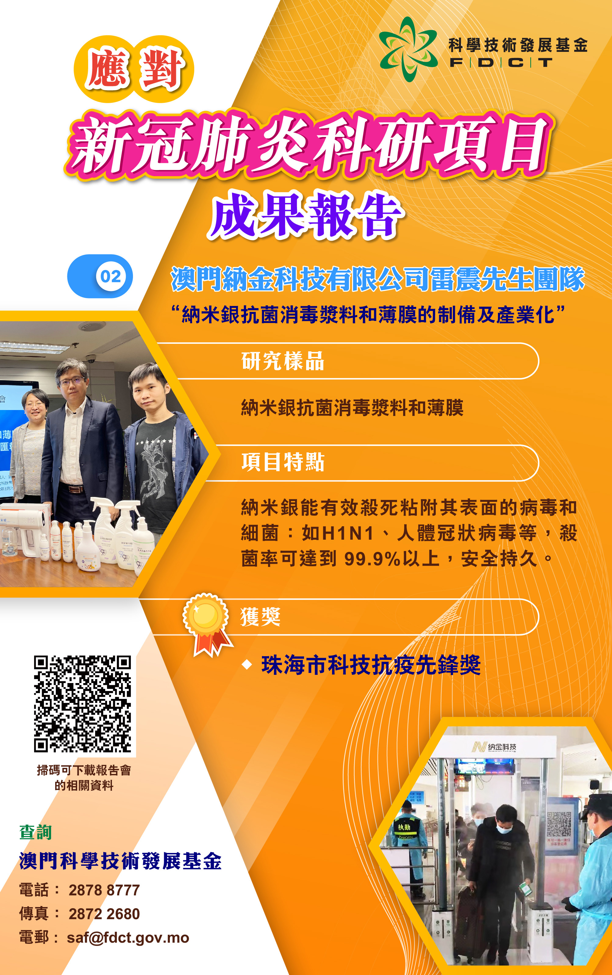為促進科研成果的應用及向公眾匯報項目的研究成果,科技基金於2022年3月29日下午3時假澳門科學館會議廳舉行「應對新冠肺炎科研項目結題報告會」,邀請來自相關政府部門、本澳大專院校、科技企業、科技社團等代表及公眾出席聽取5個應對新冠肺炎科研項目的研究成果及結題情況。項目由澳門大學、澳門科技大學和澳門納金科技有限公司的科研團隊分別進行匯報,並現場作產品演示。