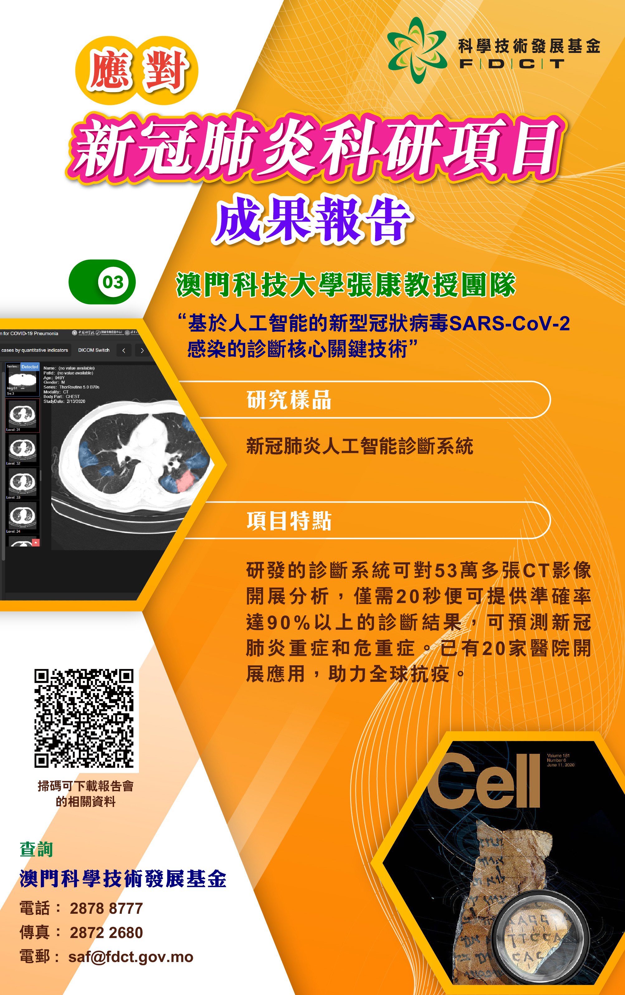 三、澳門科技大學張康教授團隊研發的“基於人工智能的新型冠狀病毒SARS-CoV-2感染的診斷核心關鍵技術”,採用機器深度學習首次對53萬多張CT影像開展分析而研發成該診斷系統,僅需20秒便可提供準確率達90%以上的診斷結果,並可預測新冠肺炎重症和危重症。成果不僅發表於世界頂級雜誌Cell,並在澳門、廣州、武漢等城市近20家醫院開展應用,同時通過雲平台部署到歐美、韓國、巴西、厄瓜多爾等多個國家與地區,助力全球抗疫。