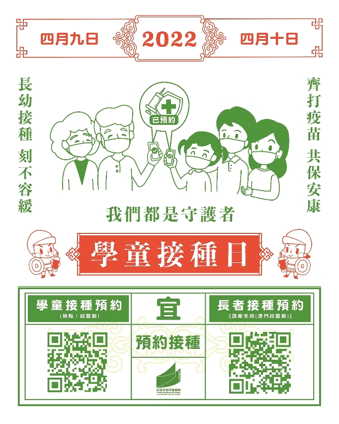 接種疫苗至少在兩個星期以後才令人體產生足夠抵抗力,教青局呼籲家長應儘快陪同3歲或以上的子女及家中長者接種新冠疫苗,保護子女和家人的健康和生命安全。家長可登入衛生局預約系統(https://app.ssm.gov.mo/sccovidvacbook/booking ) ,填妥資料後揀選群組 “學童接種日” 進行預約,並帶備家長/法定監護人及子女的身份證明文件到現場即可接種。