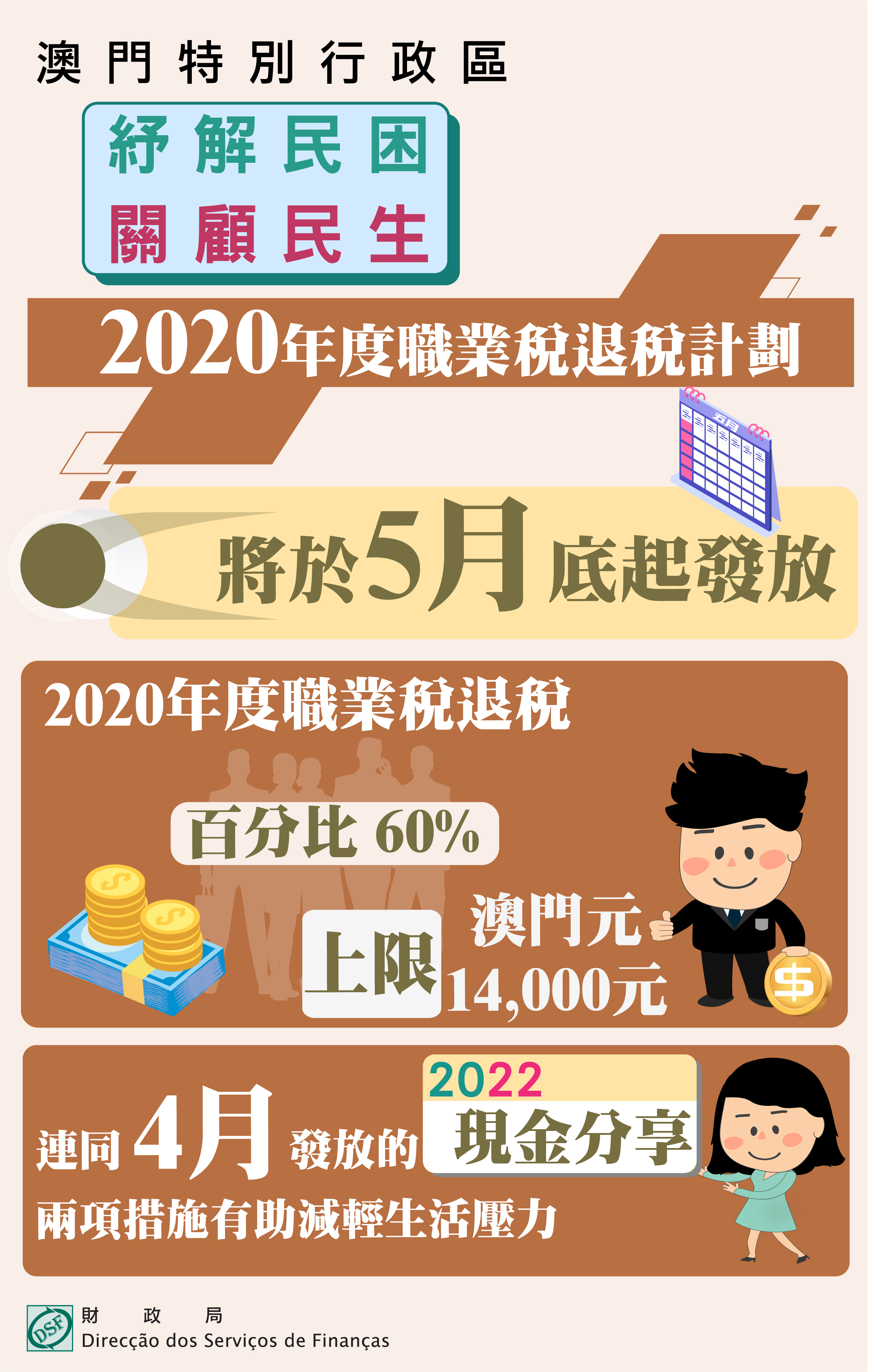 根據第21/2021號法律《2022年財政年度預算案》第21條的規定,將向2020年12月31日持有澳門特別行政區居民身份證,並已繳納2020年度職業稅稅款的納稅人,退回百分之六十稅款,上限為澳門元14,000元。
