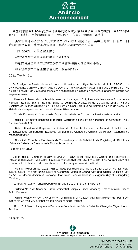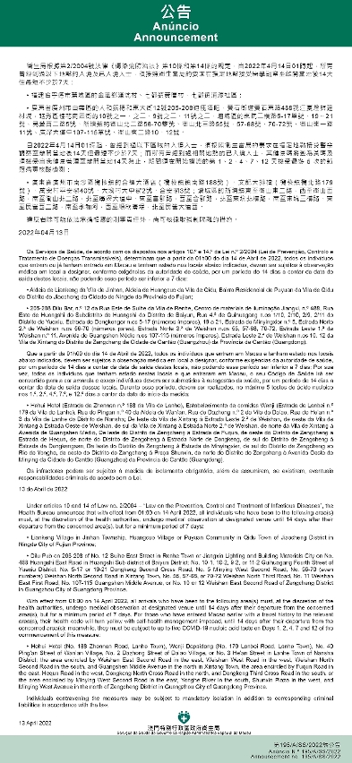 新型冠狀病毒感染應變協調中心(下稱應變協調中心)宣佈,因應內地的疫情變化,衛生局根據第2/2004號法律《傳染病防治法》第10條和第14條的規定,自2022年4月14日凌晨1時起,所有曾經到過以下地點的入境及已入境人士,須按照衛生當局的要求在指定地點接受醫學觀察至離開當地後14天但最短不少於7天:福建省寧德市蕉城區的金涵鄉濂坑村、七都鎮黃厝村、七都鎮浦源社區;廣東省廣州市白雲區的人和鎮穗和東大街12號205-208迪鹿酒吧、黃石街道黃石東路488號江夏燈飾建材城,越秀區桂花崗四街的10號之一、之二、9號之二、11號之二,增城區的東坑二橫路5-17單號、19~21號、民營西二路5號、新塘鎮的衛山北二路56-70雙號、衛山北三路55號、57-68號、70-72號、衛山東一路11號、廣深大道中107-115單號、衛山東二路10、12號。