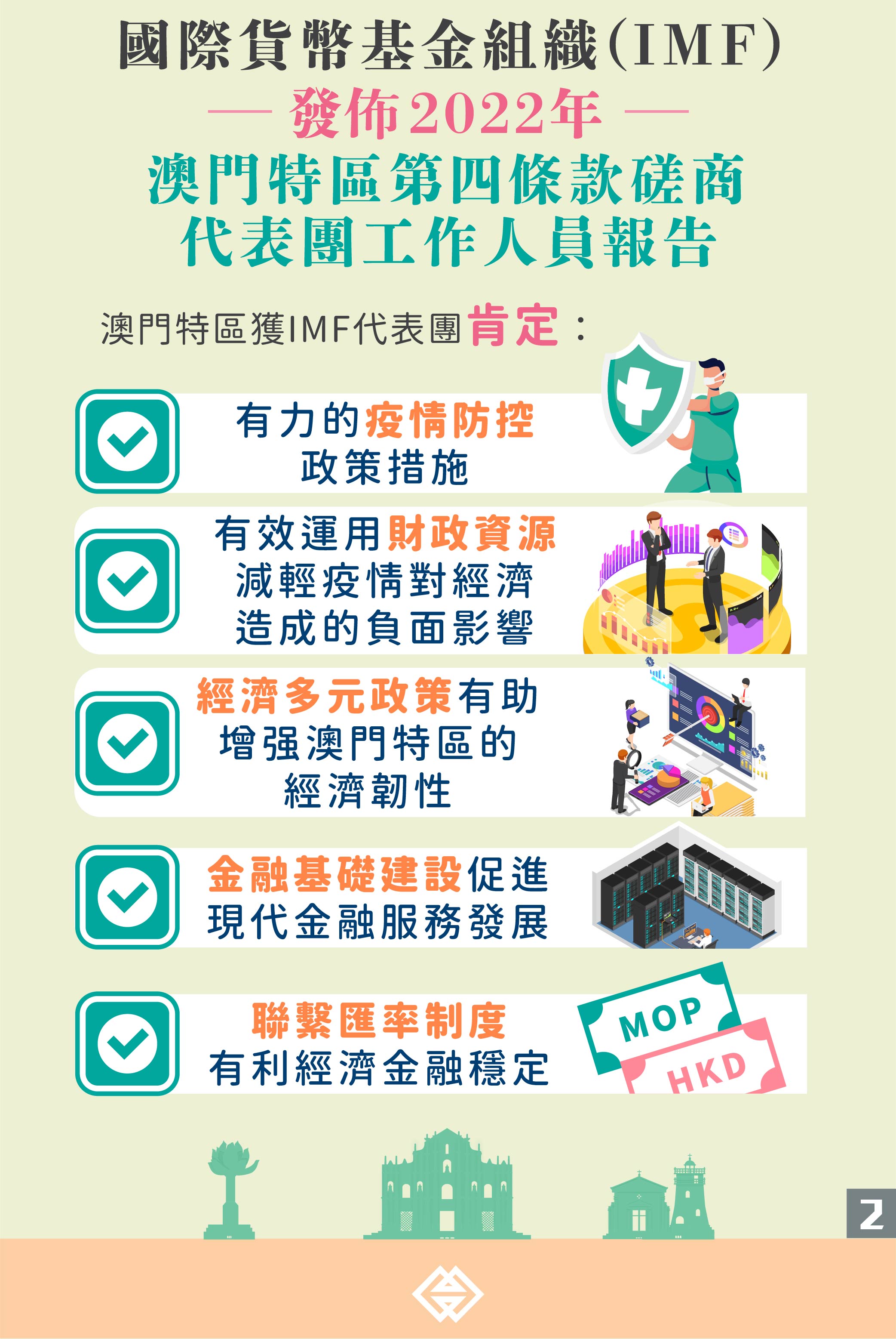 IMF再次確認澳門元與港元的聯系匯率制度,有助維護澳門特區的經濟金融穩定,並有賴於執行逆週期財政政策、維持充裕的外匯儲備及穩健的銀行體系,以及保持勞動力市場的靈活性。