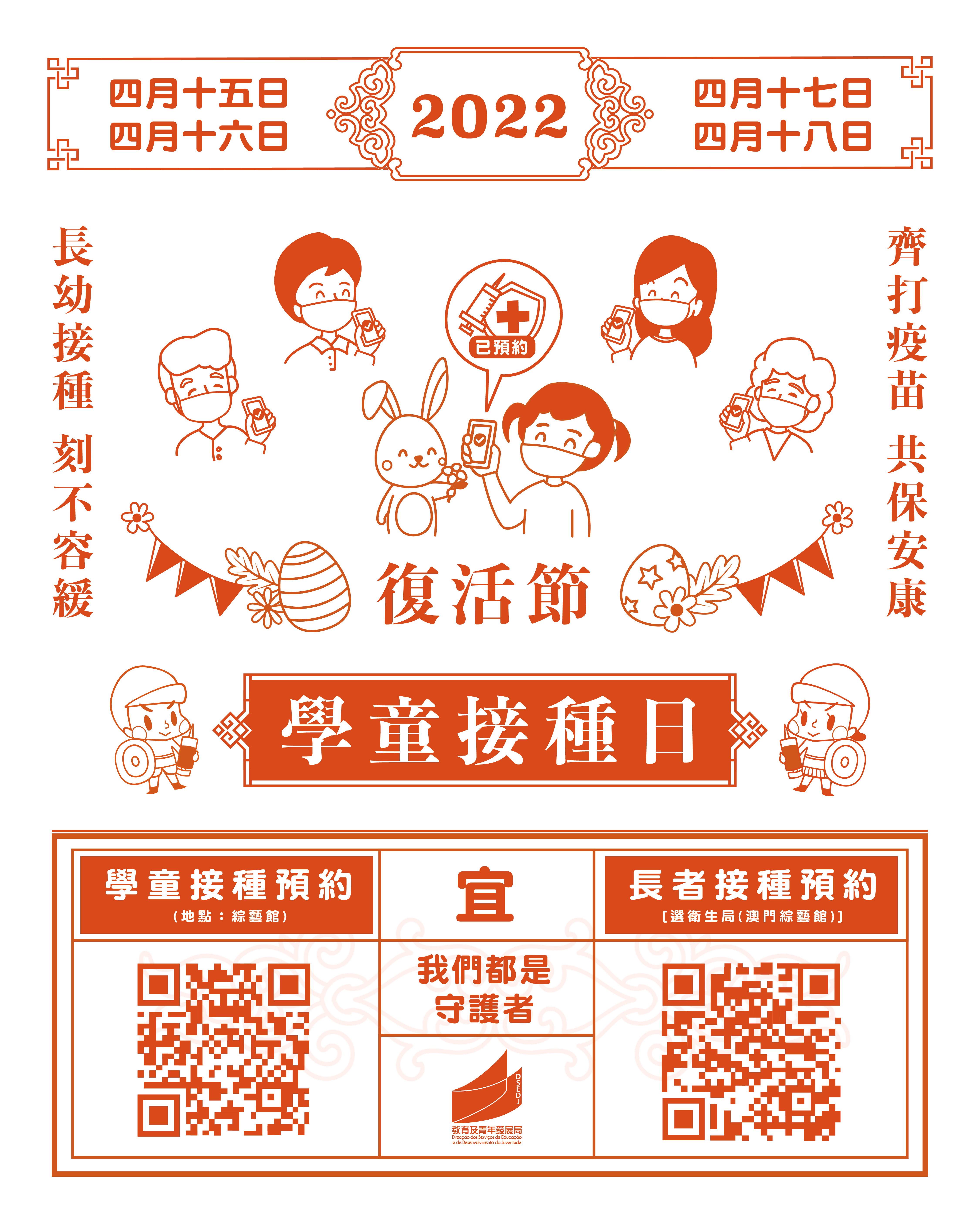 為持續推動和便利家長於復活節假期安排3歲或以上的子女及長者接種新冠疫苗,教青局與衛生局繼續於復活節假期期間於綜藝館社區大型疫苗接種站舉辦一連4天(4 月15 日至18 日)的學童接種日,時間為早上9時至傍晚6時。家長可掃描圖文包中的二維碼進行預約。現場將有由學校組織的學生義工向已接種新冠疫苗的學童派發“守護者”小襟章,以傳遞關心和鼓勵。