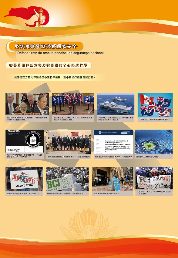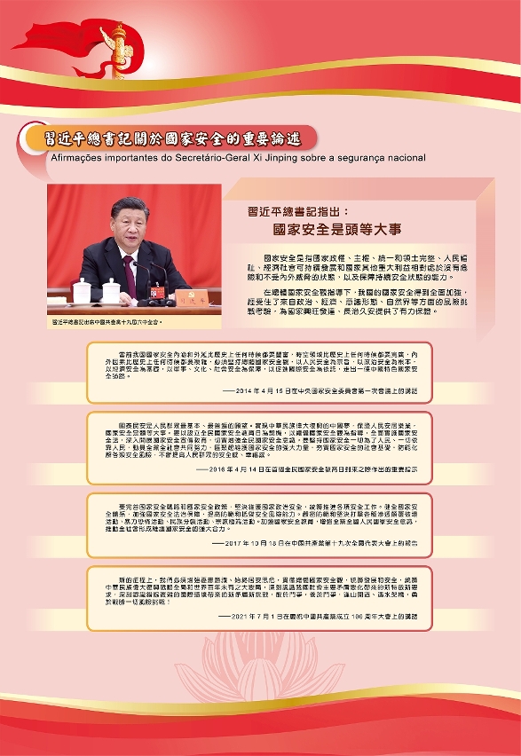 展覽前言中指出,唯有國家安全,才能守護澳門平安;只有建設更高水平的平安中國,才能有效應對由各種複雜多變的內外形勢帶來的風險與挑戰;唯有在國家主席習近平提出的總體國家安全觀的引領下,進一步完善國家安全制度體系,持續加強國家安全能力建設,才能為實現中華民族偉大復興提供堅實安全的保障,才能確保澳門“一國兩制”事業行穩致遠。