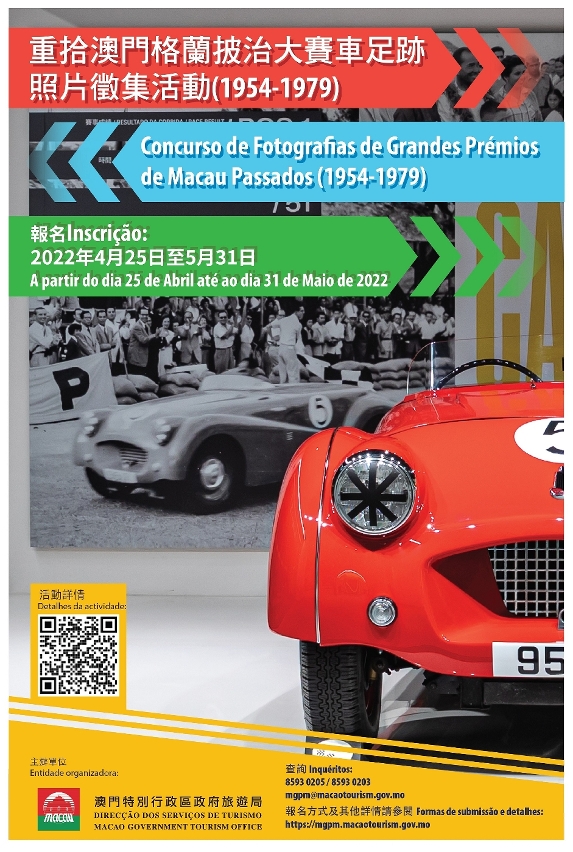 由旅遊局主辦的“重拾澳門格蘭披治大賽車足跡”照片徵集活動,將於4月25日起向澳門居民徵集澳門格蘭披治大賽車昔日的照片,經評選後的得獎作品將於澳門大賽車博物館內公開展出,共享集體回憶,見證澳門格蘭披治大賽車的變遷;另外,設於澳門大賽車博物館旁的主題咖啡廊於今(23日)開幕,添休閒文創元素。