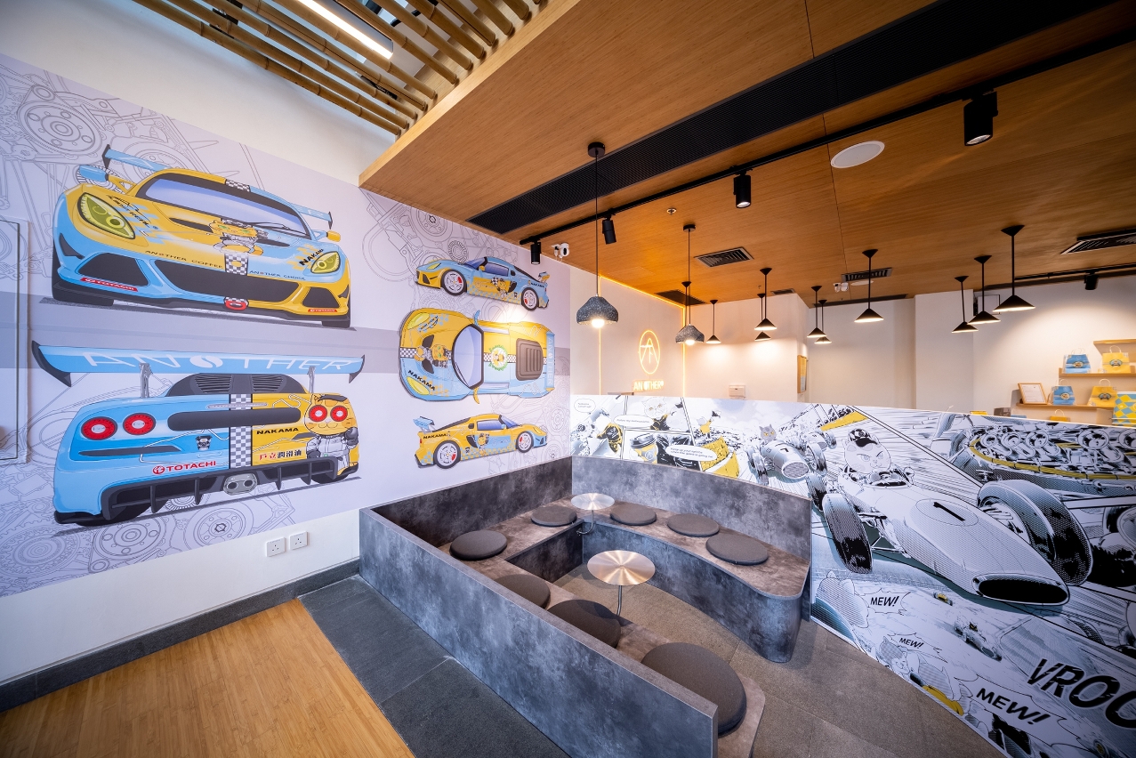 店內提供多款具大賽車元素的特色限定飲品及輕食,如格蘭披治系列沙冰、冠軍橙子冷萃咖啡、車軚蛋糕、衝線格子蛋糕及賽車窩夫等。此外,還有原創主題IP吉祥物─賽車貓(NAKAMA)相關的文創產品供選購。