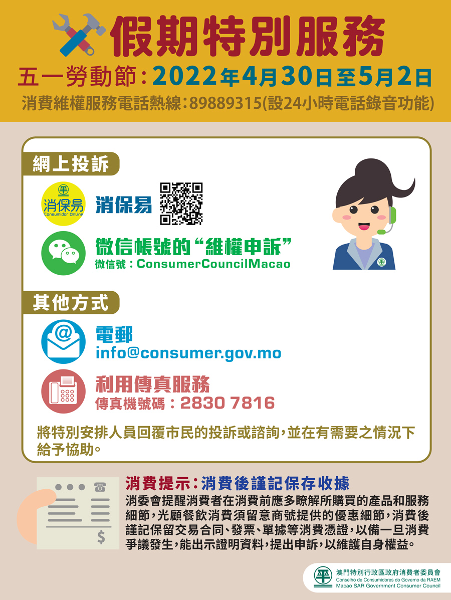 消費者委員會由4月30日至5月2日設假期特別服務,消費者可以利用“消保易”或“8988 9315”電話熱線服務(設24小時電話錄音功能)提出查詢或投訴。
