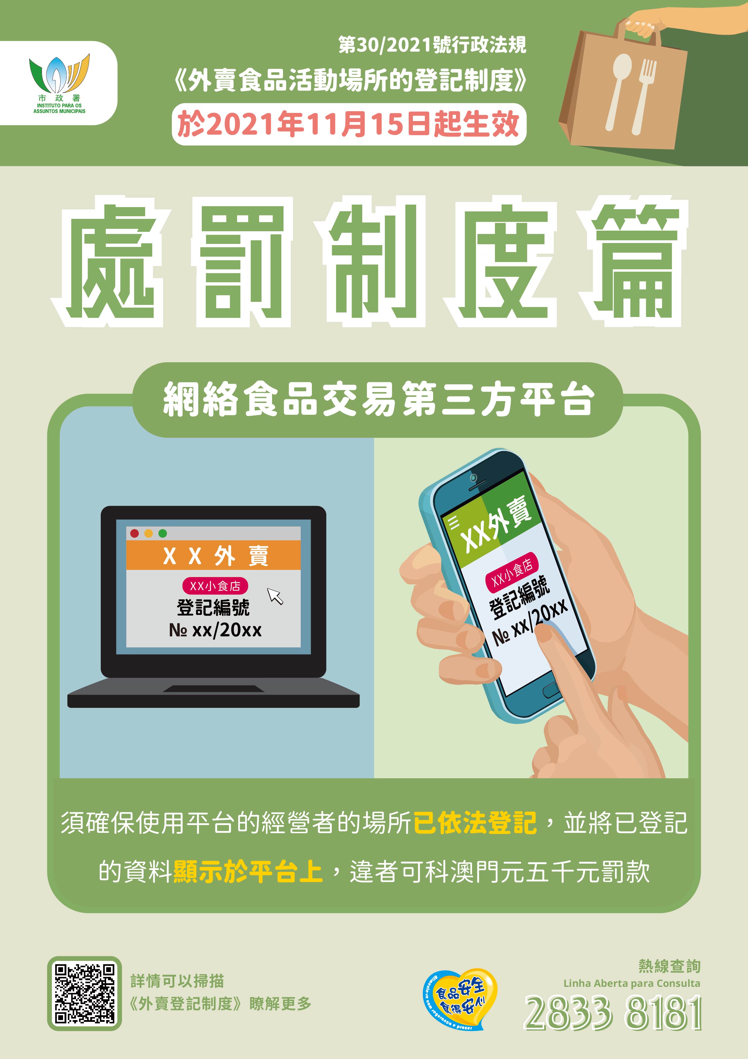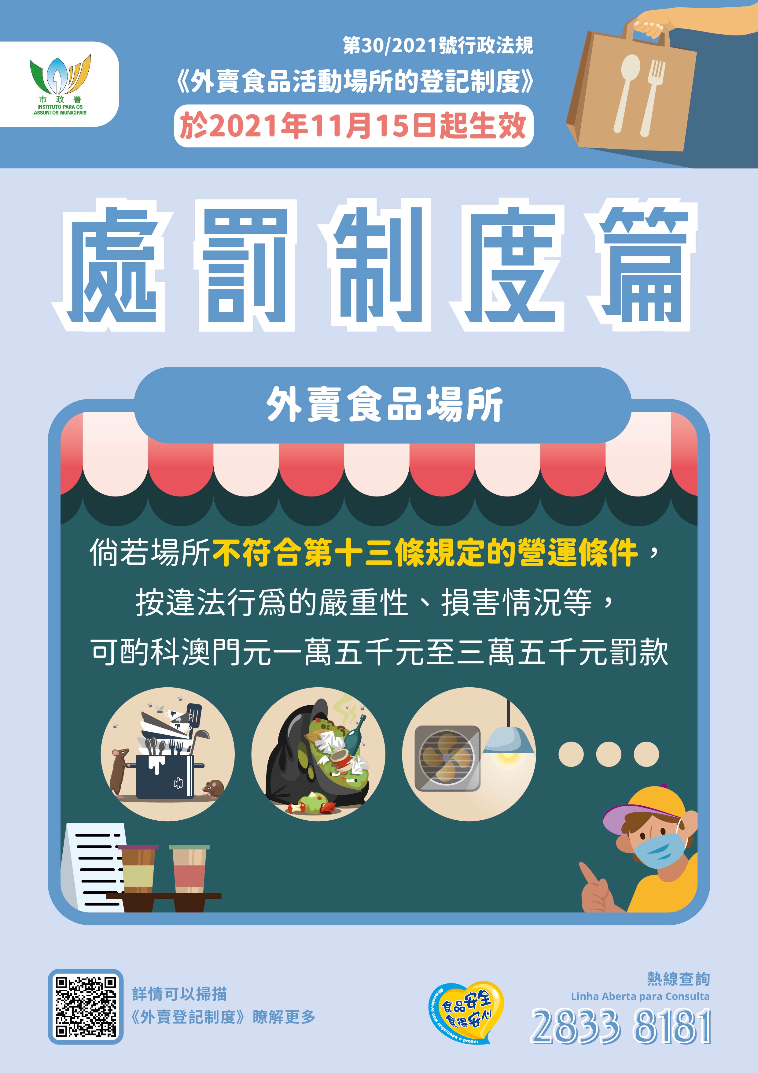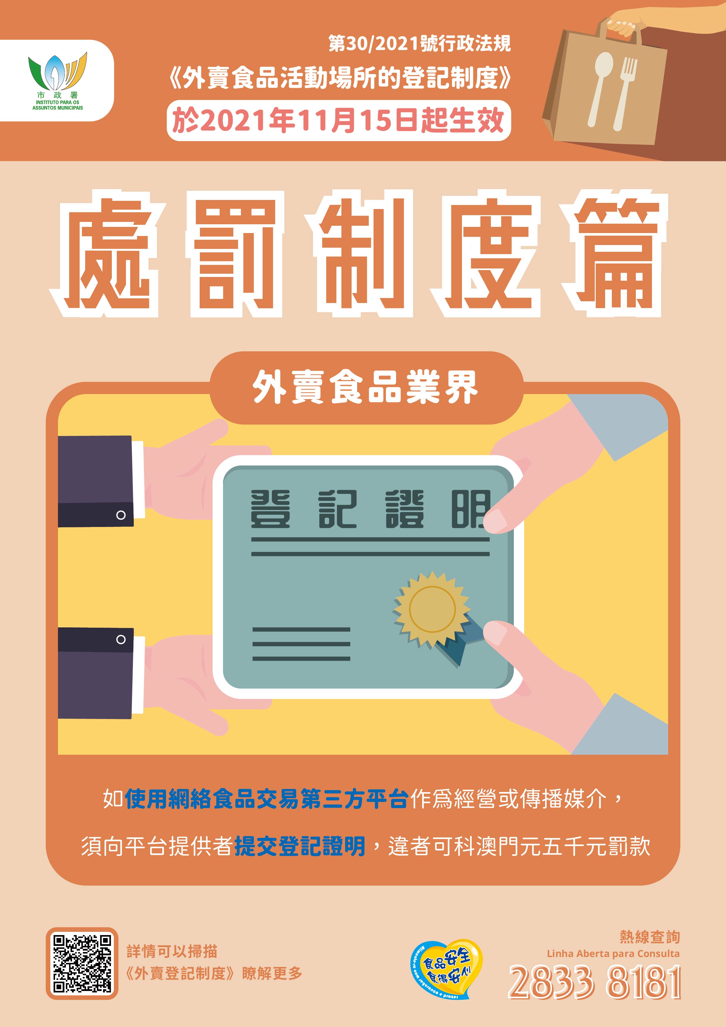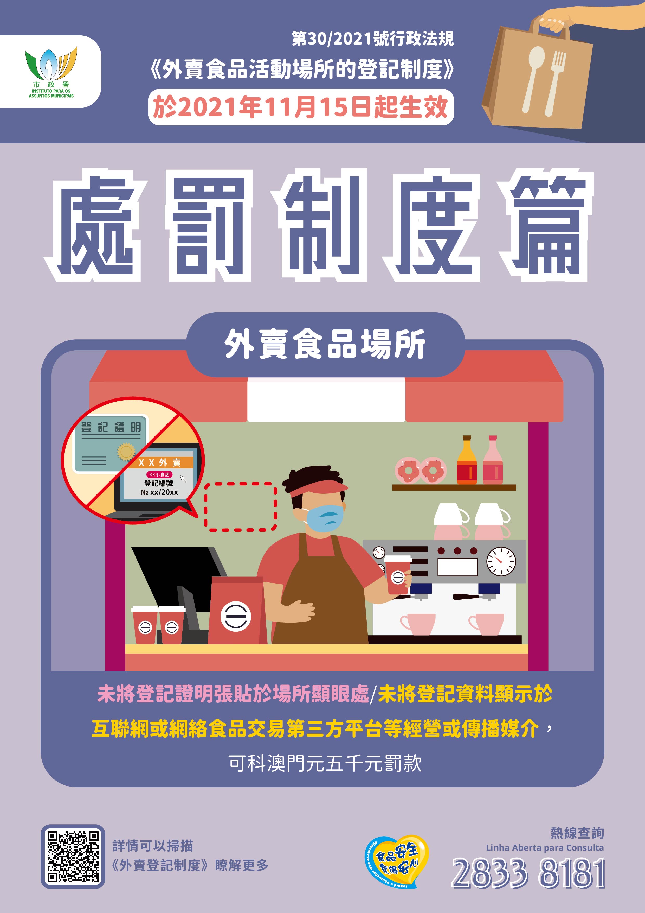 更多登記制度及食安資訊詳情,可瀏覽市政署食安資訊網 www.foodsafety.gov.mo 或手機應用程式內的“外賣食品活動場所的登記制度”專頁,亦可致電食安專線2833 8181查詢。