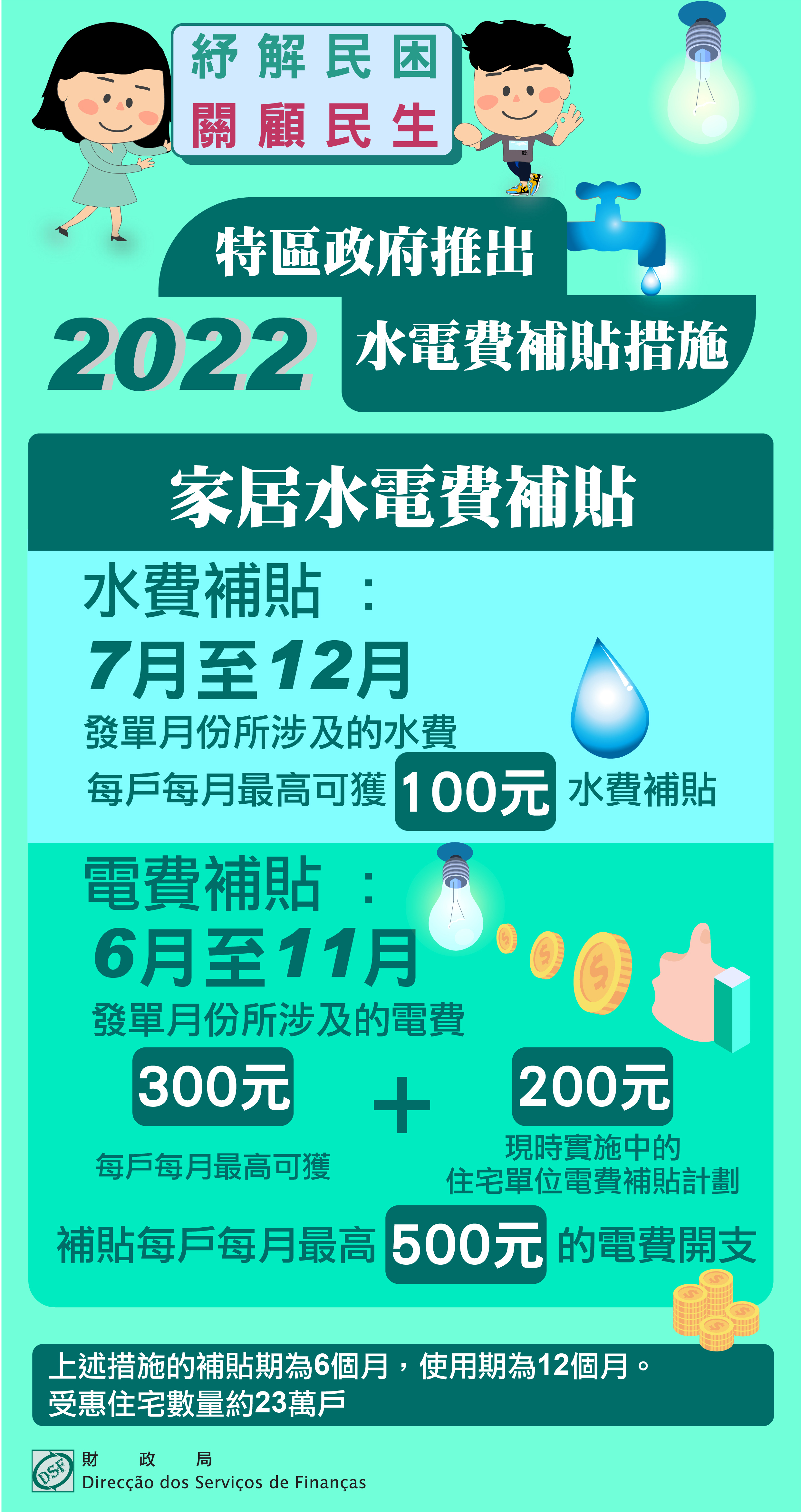 2022家居及企業商號水電費補貼措施的具體實施詳情,澳門自來水股份有限公司及澳門電力股份有限公司將於稍後公佈。