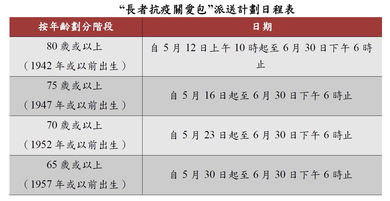 “長者抗疫關愛包”派送計劃由社會工作局、衛生局和澳基會籌劃,澳基會提供財政資助。凡於2022年12月31日或之前年滿65歲,持有效澳門居民身份證的長者,只要於2022年6月30日或之前完成接種兩劑新型冠狀病毒疫苗或持有由衛生局發出不適合接種疫苗的證明書,便可於5月12日至6月30日期間攜同身份證明文件前往派發服務點領取關愛包,每位合資格的長者僅可領取一次,每份關愛包為面值合共250澳門元的禮券。關愛包由社團選購適合長者的禮券並協助派發。