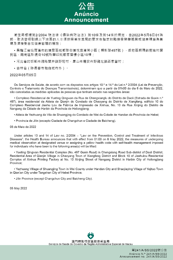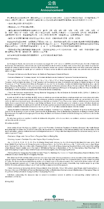 新型冠狀病毒感染應變協調中心(下稱應變協調中心)宣佈,因應內地的疫情變化,衛生局根據第2/2004號法律《傳染病防治法》第10條和第14條的規定,自2022年5月6日凌晨1時起,所有曾經到過以下地點的入境及已入境人士,須按照衛生當局的要求在指定地點接受醫學觀察至離開當地後14天但最短不少於7天:
