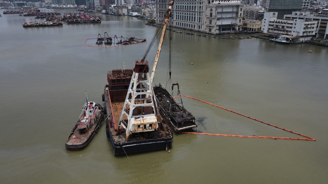 早前內港的漁船火警六艘涉事漁船中,一艘漁船由海事局救援船拖回岸邊,有一艘漁船隨水漂流至內港客運碼頭對開的一段內港航道並下沉,另有四艘相連漁船在內港錨地下沉。海事局全力協助下沉漁船的打撈和善後工作,安排打撈船隊到現場進行評估及擬定計劃,並於今日早上開始打撈作業。