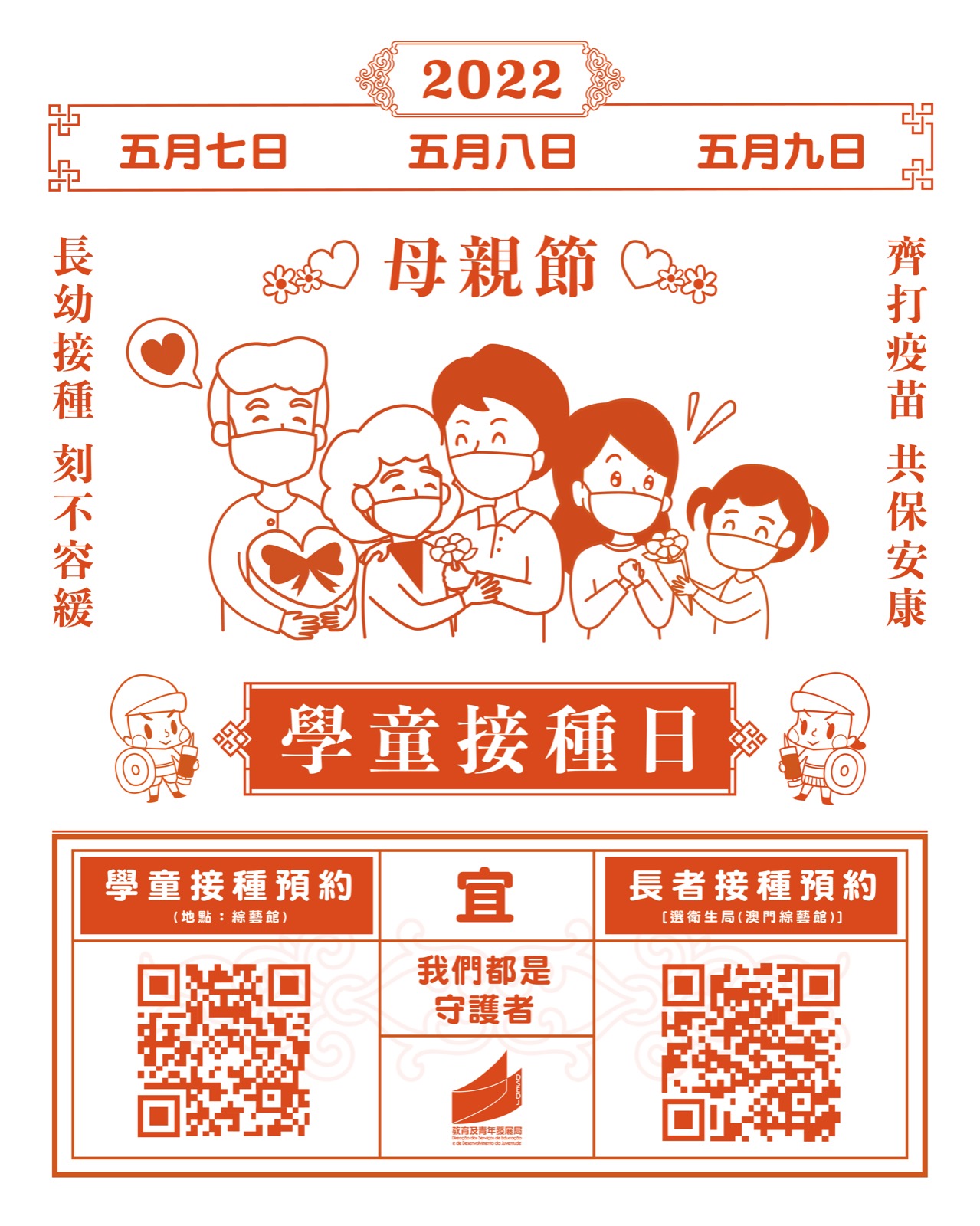 教育及青年發展局與衛生局繼續推動學生儘快接種新冠疫苗,於今日(5月7日)至5月9日早上9時至下午6時在綜藝館社區大型疫苗接種站舉辦“學童接種日”,方便家長帶同子女接種新冠疫苗。現場將設義工站,由學校組織學生義工向已接種新冠疫苗的學生派發“守護者”小襟章。