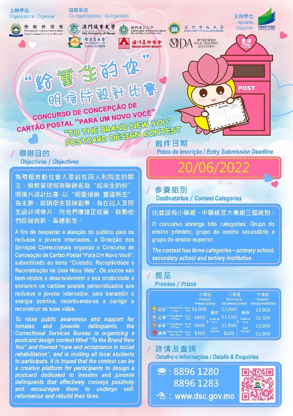 明信片設計比賽設有小學組、中學組及大專組三個組別,參賽者可選擇以手繪或任何電腦設計軟件進行繪畫。其中小學組參賽者須選用懲教管理局提供之關愛大使“晴晴”明信片填色稿進行繪畫。歡迎學生踴躍參與,可於懲教管理局網頁 www.dsc.gov.mo 下載參賽表格;參賽作品可由即日起至6月20日遞交至懲教管理局服務諮詢中心(澳門南灣大馬路中華廣場8樓A座),其中電繪作品亦可電郵至主辦單位郵箱campaign@dsc.gov.mo。
