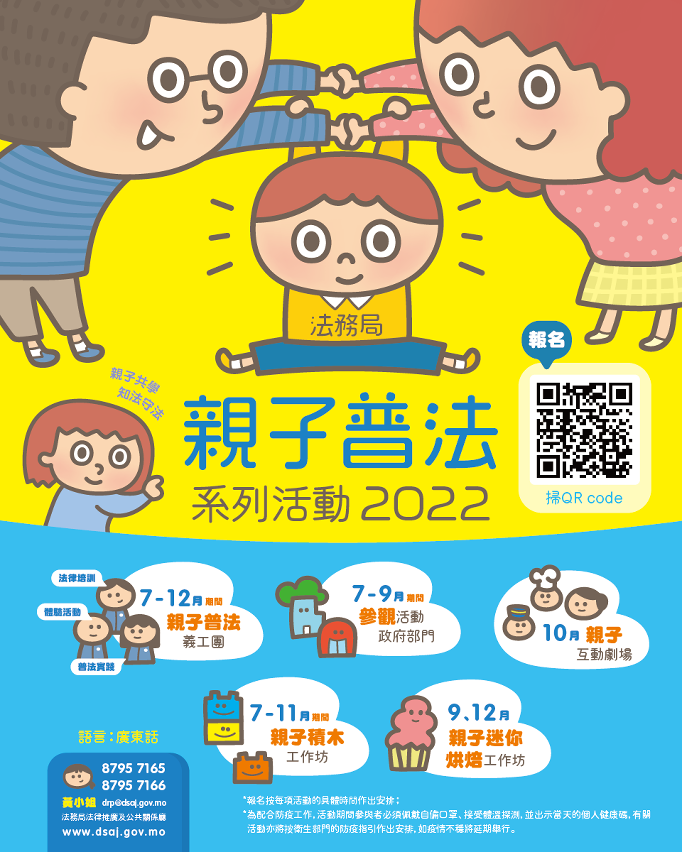 “2022親子普法系列活動”包括成立2022親子普法義工團、舉辦親子互動劇場、親子積木工作坊、迷你烘焙工作坊,參觀政府部門運作和交流活動等,當中“親子普法義工團”由即日起進行招募,歡迎本澳6至12歲兒童及家長報名,有興趣者可掃瞄海報二維碼或登入法務局網頁(https://www.dsaj.gov.mo/regonline/regpcevent.aspx)進行報名及瀏覽活動章程,招募名額共30對,如報名人數超過招募數量,將以電腦抽籤方式決定,報名截止日期為6月15日,確定名單將於6月30日公佈。