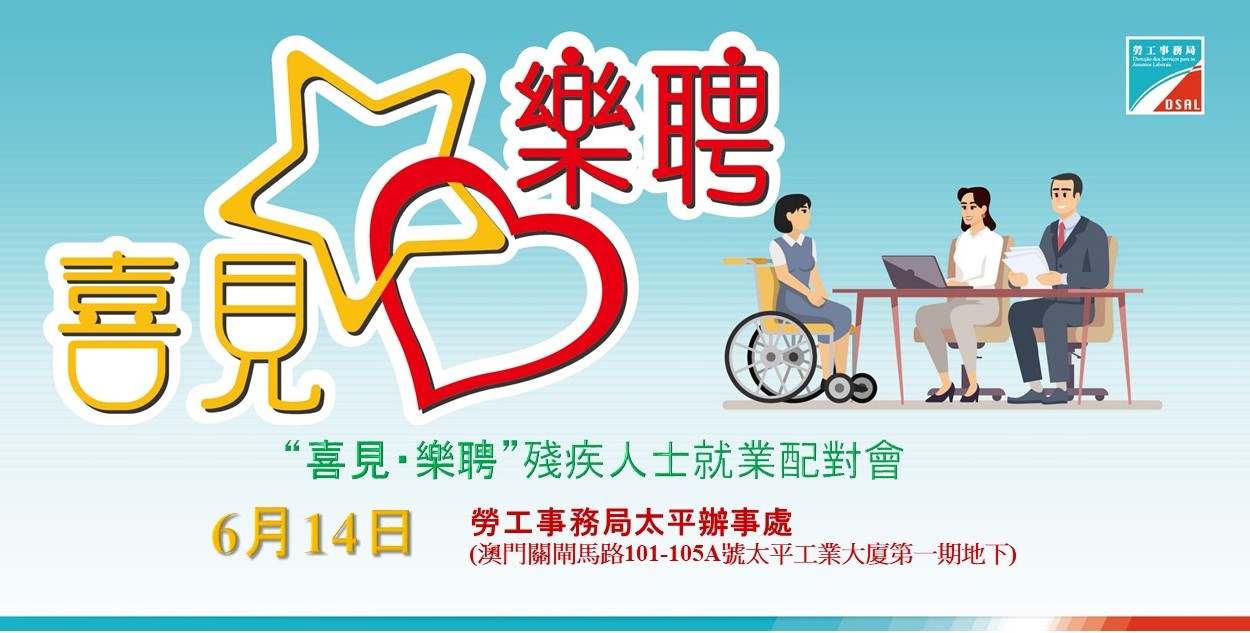 勞工局一直關注殘疾人士的就業情況,持續推動僱主聘用殘疾人士,提升殘疾人士的就業機會,勞工局將於本年6月14日(由上午10:00至中午1:00;下午2:30 至5:00)在勞工局太平辦事處舉辦“喜見・樂聘”殘疾人士就業配對會,即日起至6月2日接受求職者網上報名參與。
