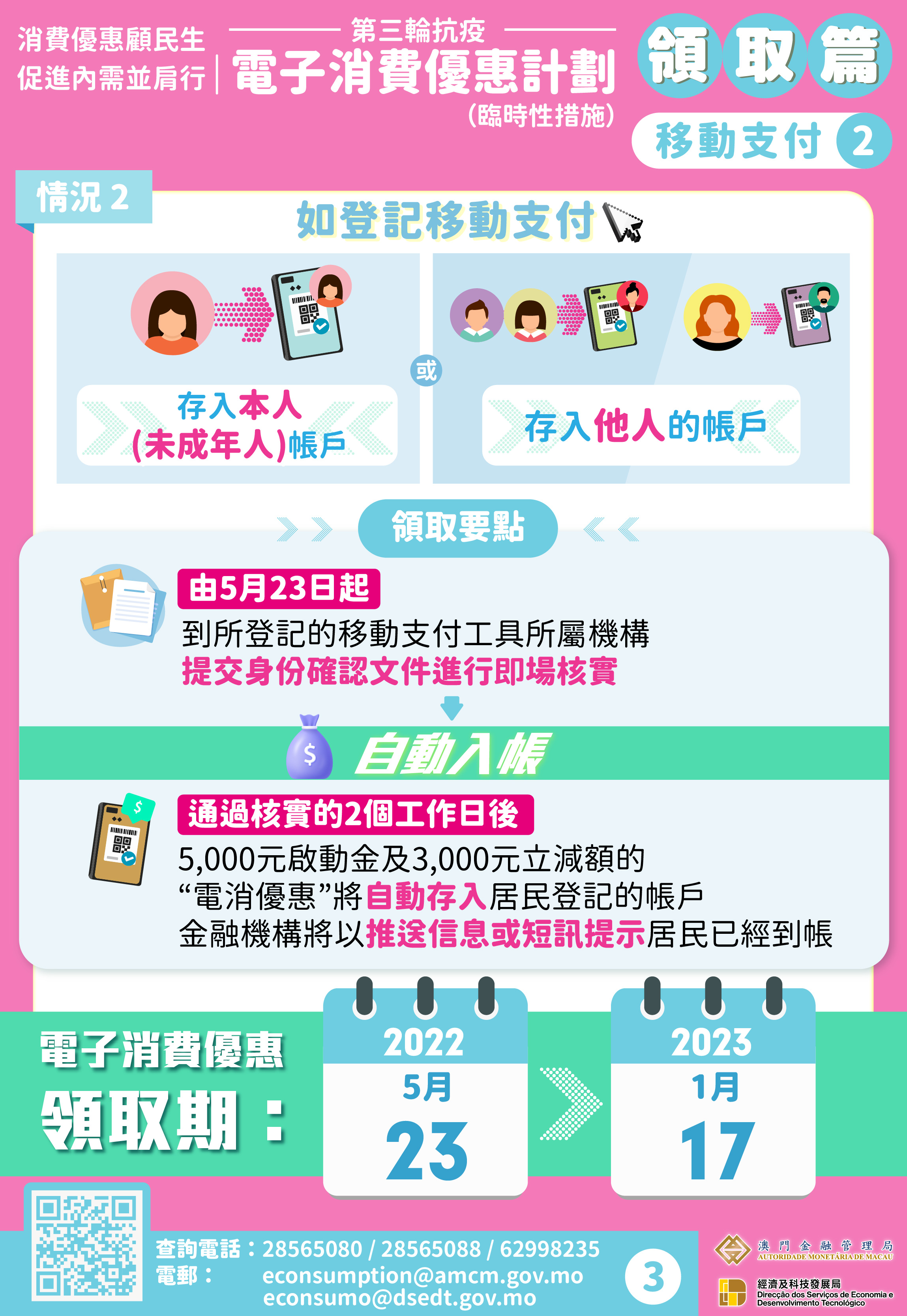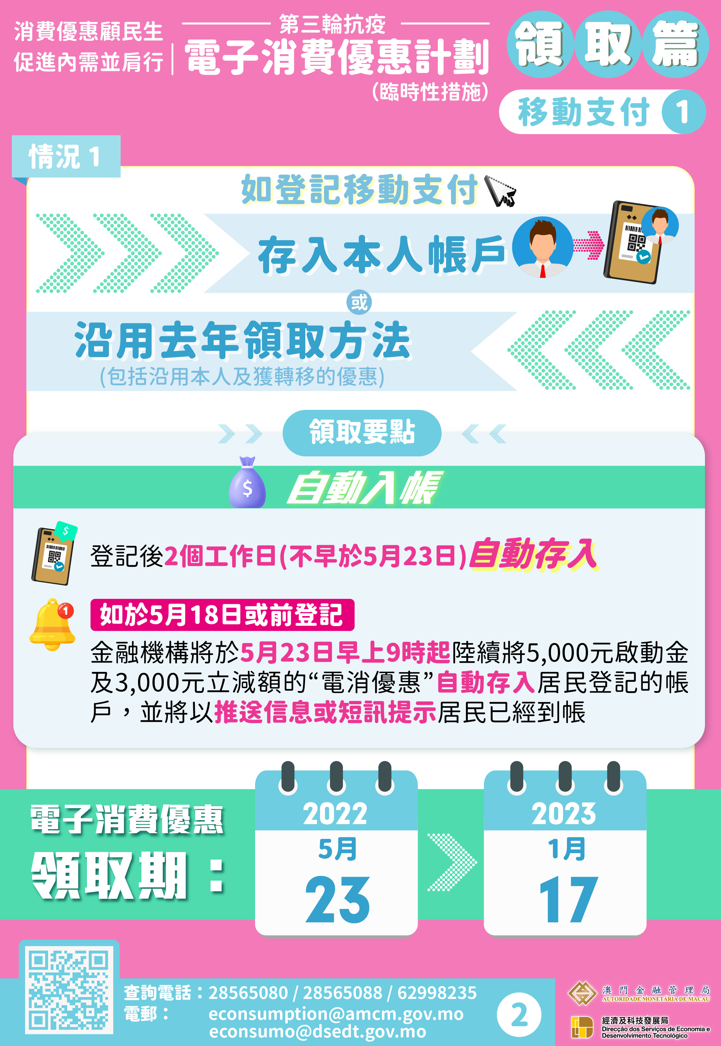 居民如選擇以“消費卡”領取,並已於5月18日或之前完成登記,明日起可到全澳174個服務地點拍卡領取優惠。如居民前往的服務點人流較多,可選擇到附近其他網點拍卡,亦可稍後時間再拍卡加值。領取期至2023年1月17日,不需急於首日領取。