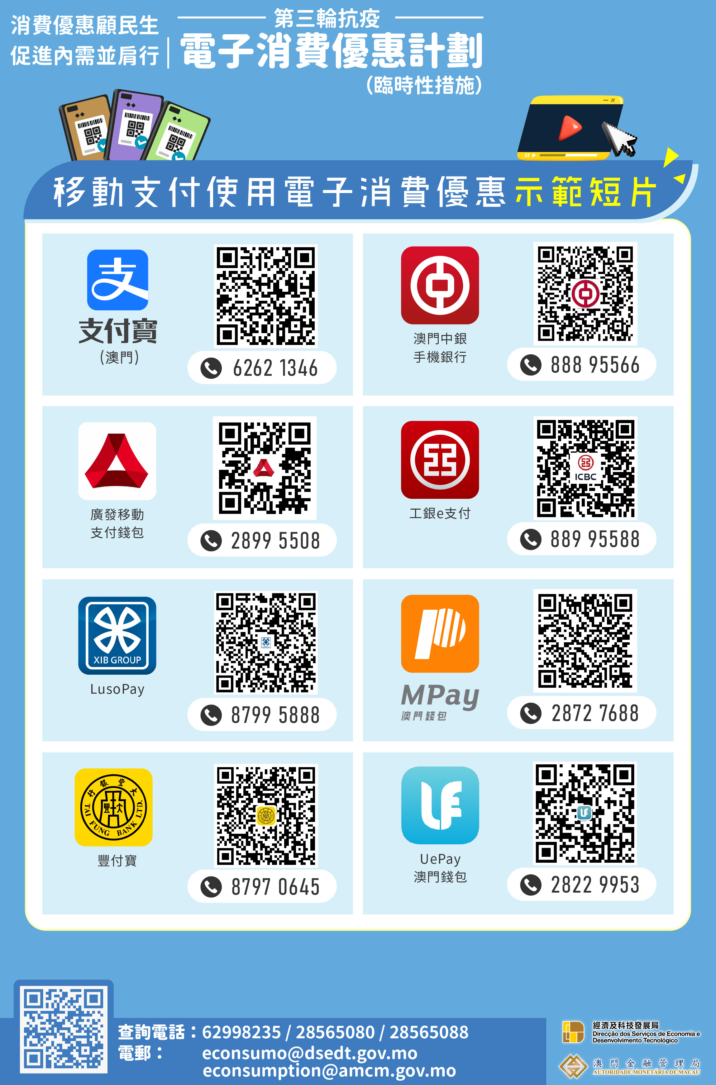 金融機構已推出各自移動支付工具使用“電消優惠”的示範短片,演示消費付款、查詢餘額或交易詳情等各項功能及步驟,有關短片將匯集至計劃專題網頁( https://www.dsedt.gov.mo/econsumo )。