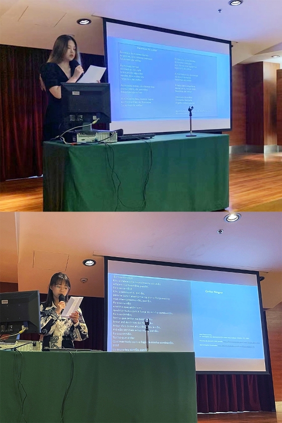 就讀葡萄牙語學士學位課程的大三學生方欣怡以中葡雙語朗讀了《我們會回來的》(Havemos de voltar) ,抑揚頓挫的吟誦中,深深感染了席下觀眾。葡萄牙語課程大三學生譚楚妍聲情並茂地朗誦了詩人代表作,《我是煤》(Eu sou carvão)及《我想成為一個鼓》(Quero ser tambor) ,悅耳動聽。
