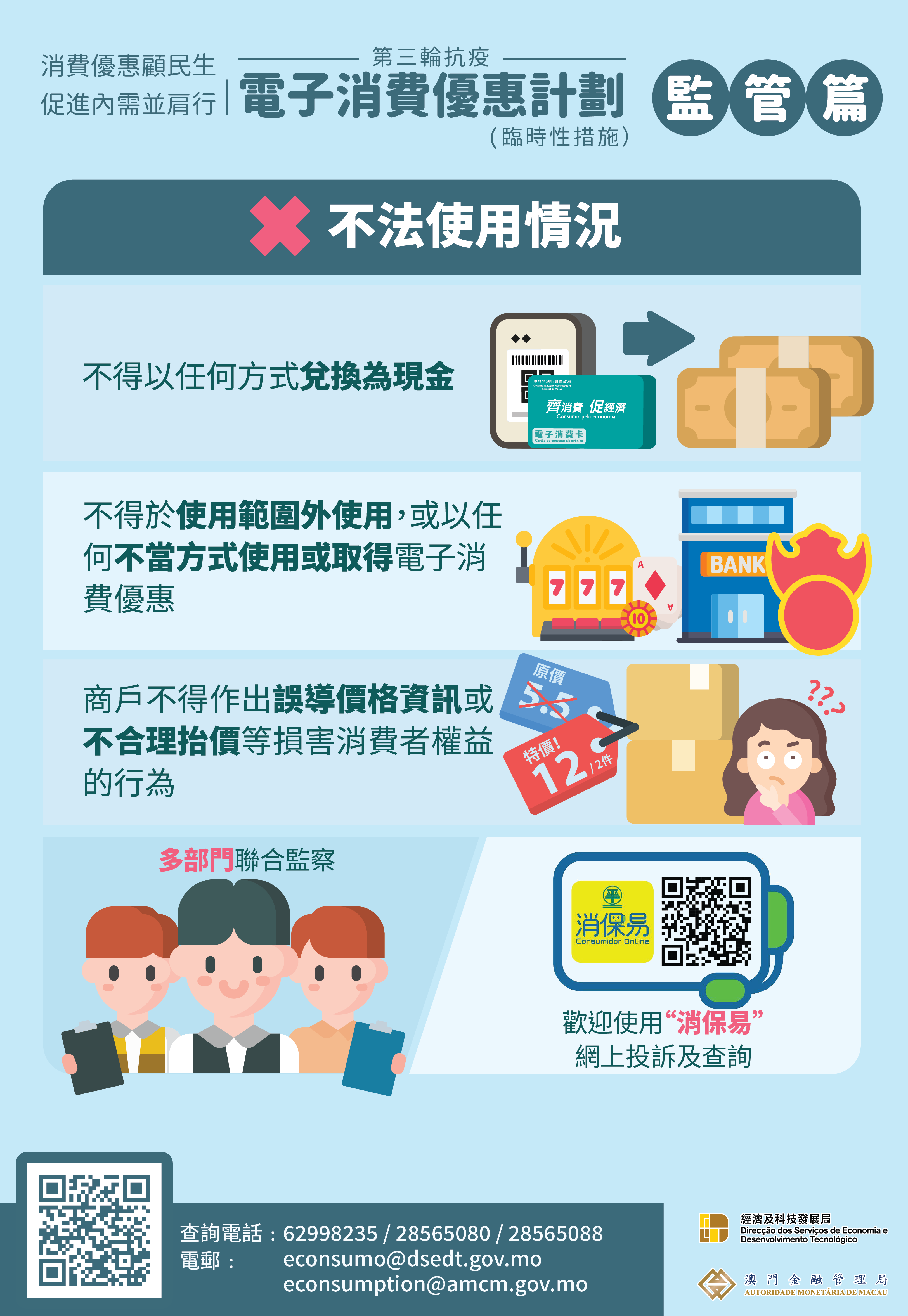 “電消優惠”公佈後,經科局持續進行廣泛宣傳,透過派發海報等方式,讓商戶瞭解使用規則。經科局提醒業界,根據第19/2022號行政法規《第三輪抗疫電子消費優惠計劃》的規定,商戶不得以不法方式收取消費優惠;不得作出誤導價格資訊或不合理抬價等損害消費者權益的行為,且須履行充分合作的義務。如發現違規情況,經科局可按相關行為的嚴重性及過錯程度,停止所屬商業企業主的全部或部分商業場所在指定期間內收取電子消費優惠。