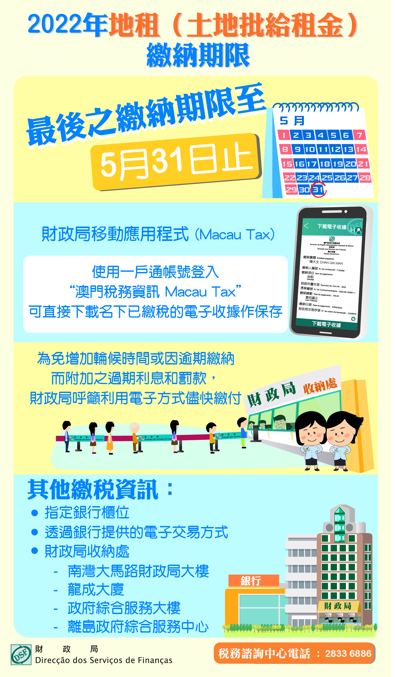 2022年地租(土地批給租金)最後之繳納期限至5月31日止,為免增加排隊輪候時間或因逾期繳納而附加之過期利息和罰款,財政局呼籲倘仍未繳納上述地租者儘快繳付。