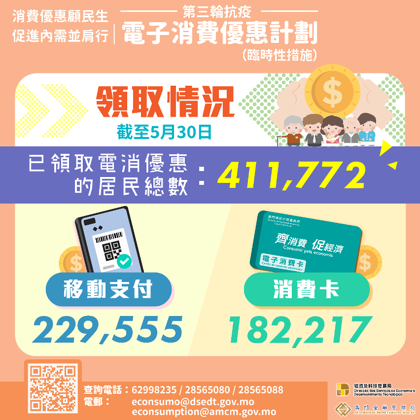 自5月10日起登記,5月23日起領取,截至昨(30)日,已有逾54.4萬名居民完成登記,當中逾25.5萬人登記移動支付,約28.9萬人登記消費卡。