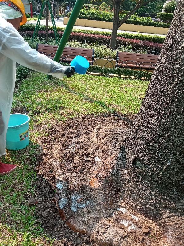 市政署樹木養護人員持續對古樹進行巡查監察,發現得勝花園一株異葉南洋杉古樹生長勢持續轉弱,日前已再進行救治、施肥及修剪工作。