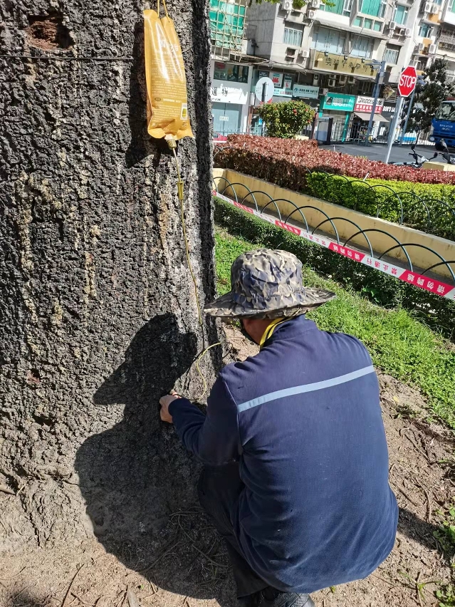 位於得勝花園一株異葉南洋杉古樹(編號864)於二〇二一年生長勢明顯持續轉弱,有白蟻危害、枯枝等情況,養護人員同年進行了一系列養護措施,分別更換支撐架,施白蟻藥、促根劑,並再修剪已枯萎之枝條等,惟生長勢未見好轉。養護人員日前繼續進行救治及護理工作,包括施肥、掛營養液及修剪枯枝等,希望樹木能恢復生機。市政署將持續跟進古樹狀況,並適時作出跟進處理。