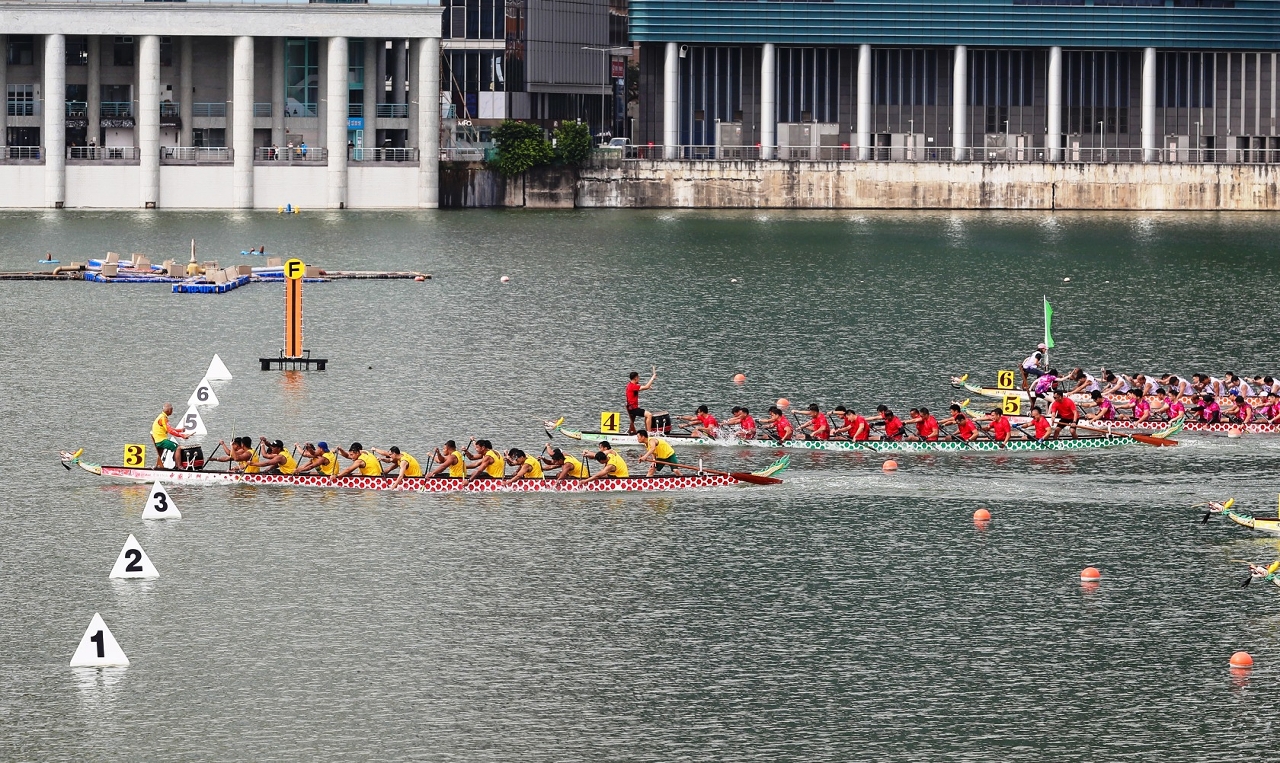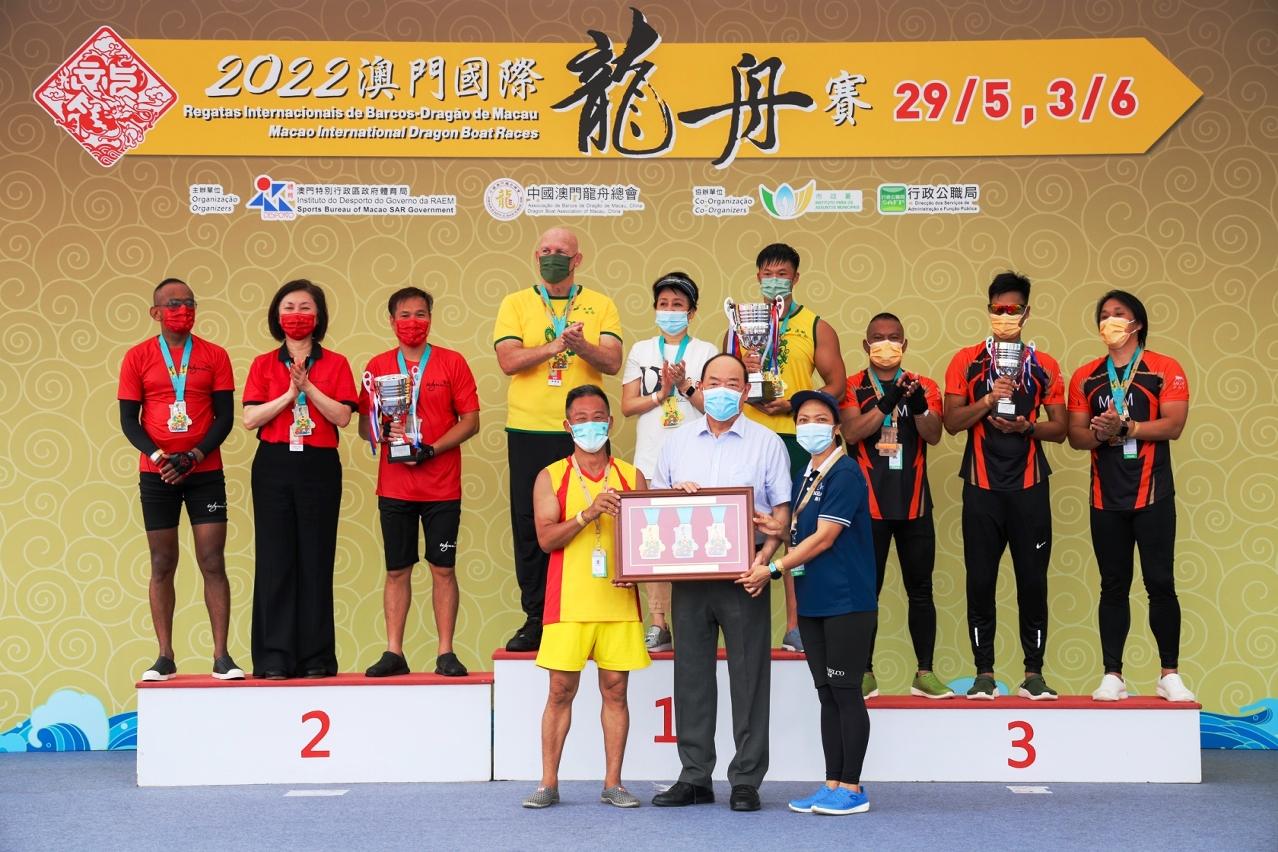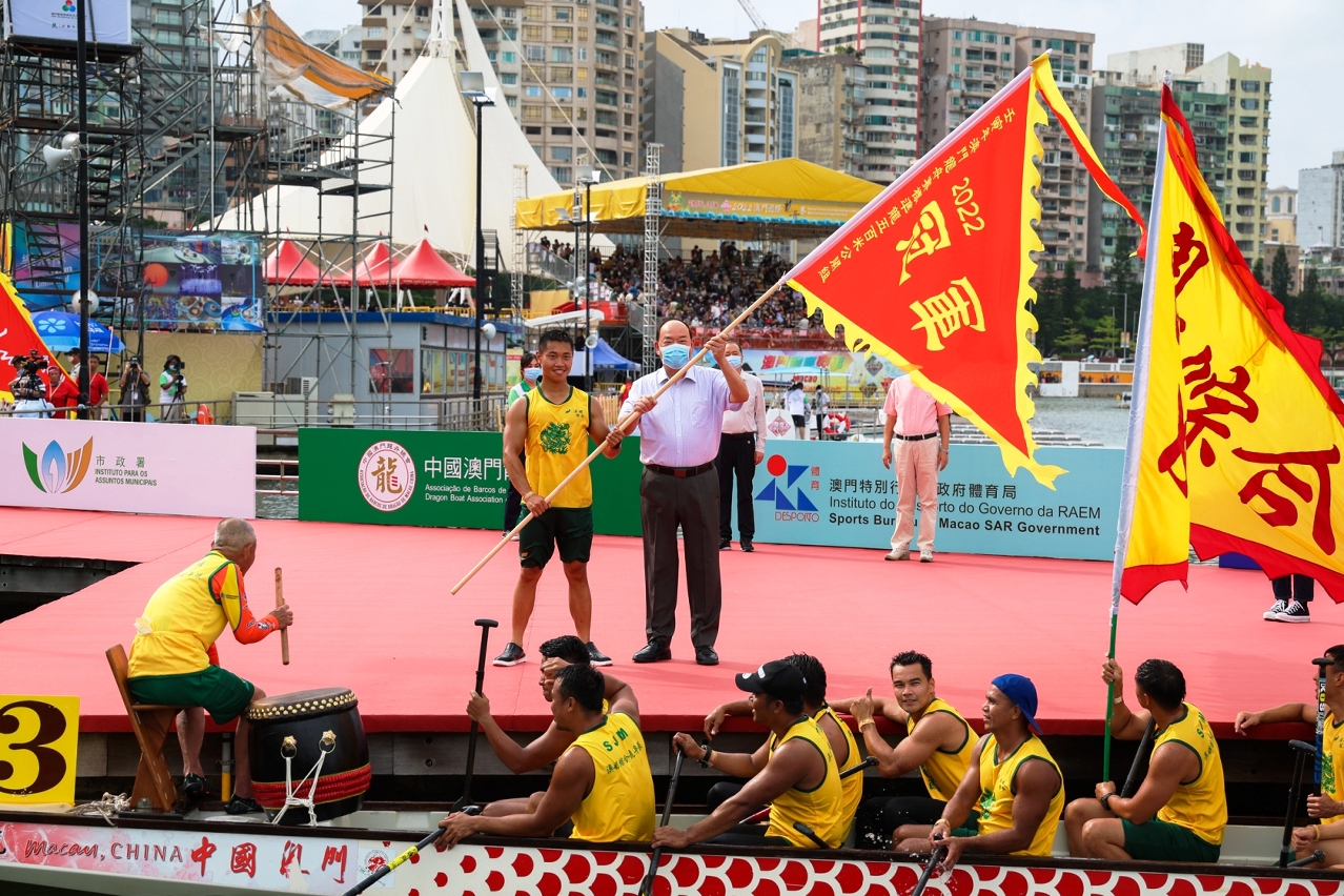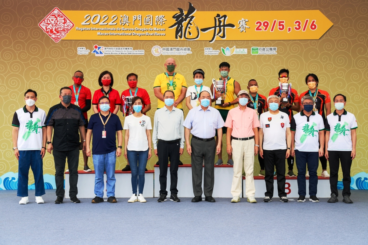 由體育局及中國澳門龍舟總會主辦,市政署及行政公職局協辦的“2022澳門國際龍舟賽”,今日(3日)端午節正日在南灣湖水上活動中心上演標準龍(500米)公開組及女子組賽事。經過連場競逐後,澳娛綜合-金禧與澳門青少年發展協會分別勇奪公開組及女子組冠軍。行政長官賀一誠出席活動觀賞龍舟賽事,並主持點睛儀式及頒獎,與市民歡度端午佳節。