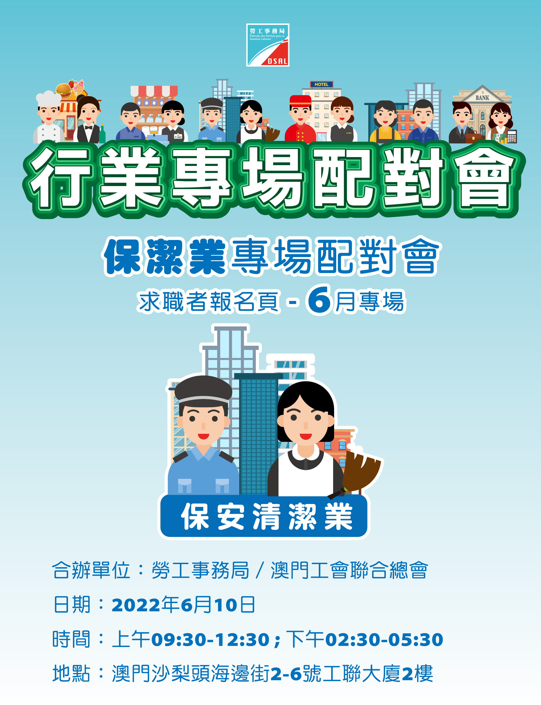 因應本澳就業市場的變化,為協助有求職需要的居民盡快就業,6月份勞工事務局繼續與澳門工會聯合總會(下稱“工聯”)合辦9場專場配對會,當中涉及餐飲、保安清潔、醫護、社會服務及零售等多個行業。