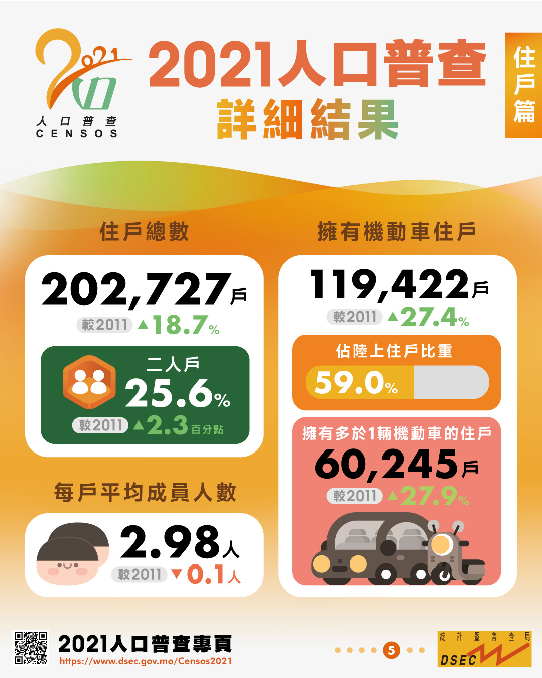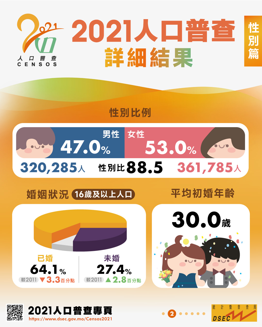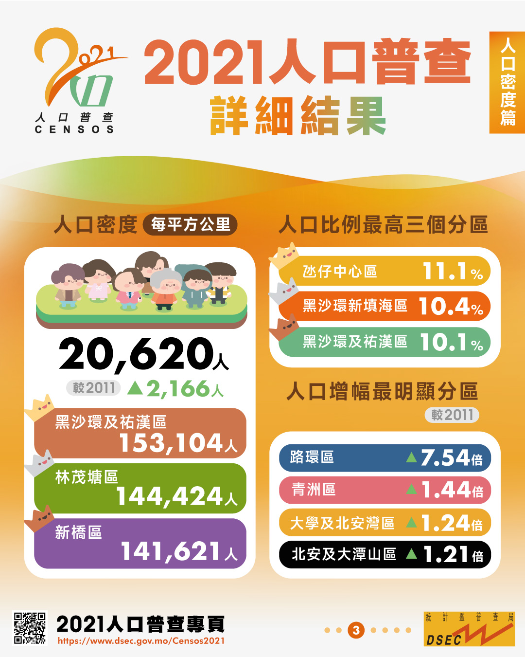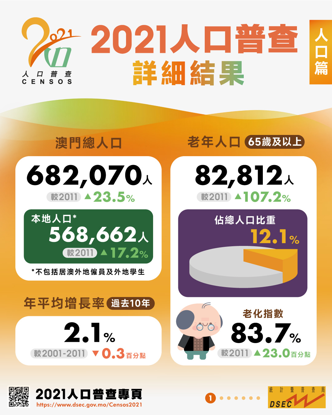 為收集詳細的人口數據,統計暨普查局於2021年8月進行了第16次人口普查及第6次住屋普查;繼去年底公佈了2021人口普查初步結果後,現公佈《2021人口普查詳細結果》報告,並同時在網頁推出「統計地理資訊系統(GIS)」及「人口數據資料庫」兩個查詢工具,方便市民迅速查找人口資料。