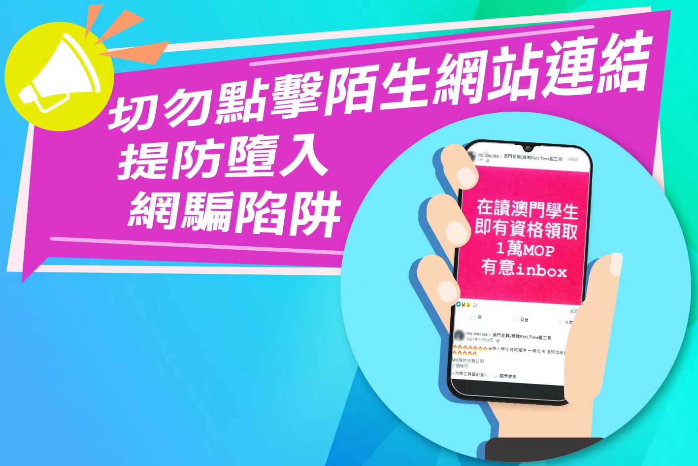 近日,有市民向司法警察局反映,稱有人於網絡社交平台一招聘群組內發佈附有網站連結的帖文,懷疑是網絡詐騙陷阱。發文者聲稱在讀澳門學生有資格領取巨額獎金,而帖文所載網站則是一頁活動報名表格,要求參加者填寫個人資料,惟沒有任何關於舉辦該項活動機構的資料。經司警局調查,證實上述活動為子虛烏有,極有可能是不法份子假借舉辧活動之名,藉此套取個人資料。