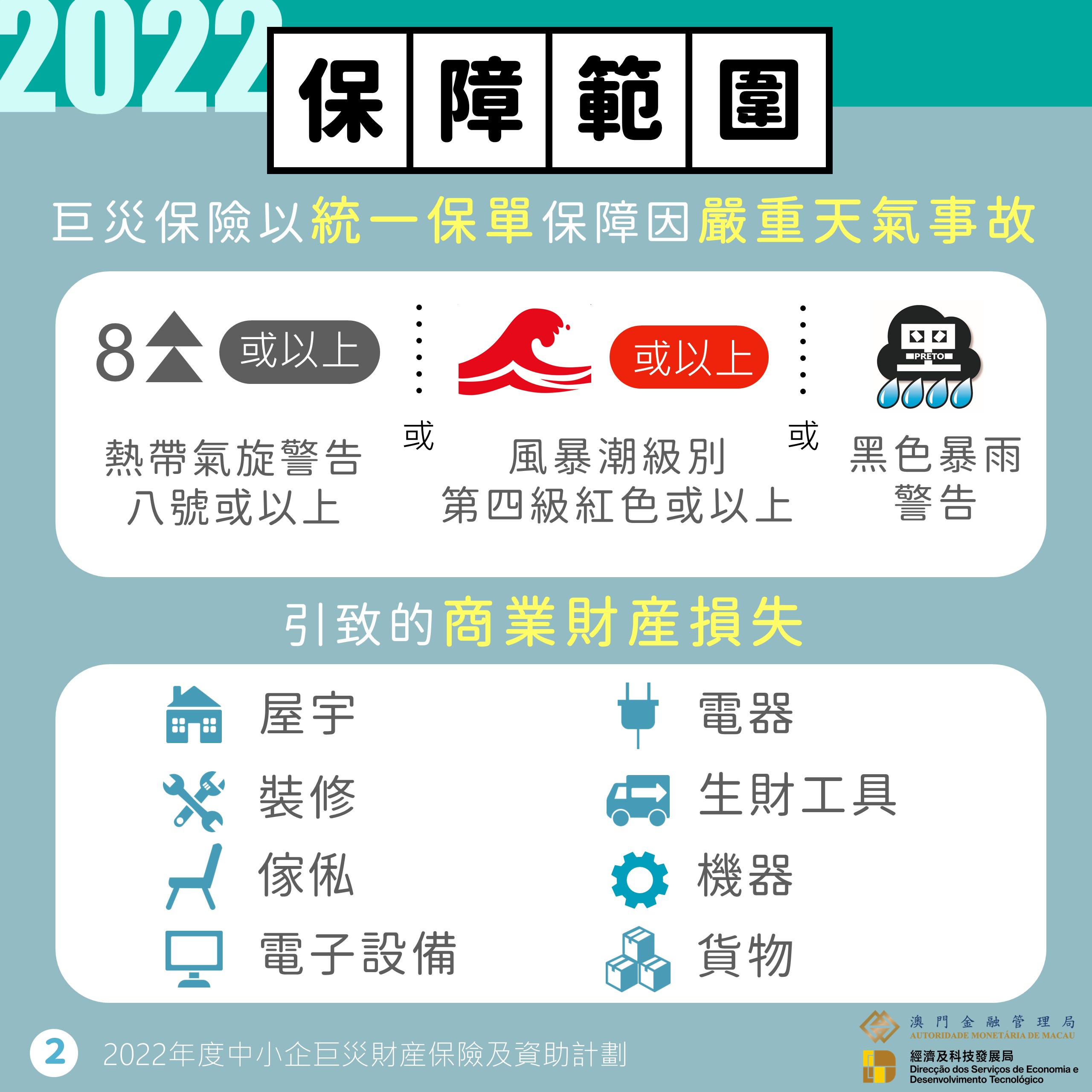 鑒於過去數年極端暴雨事件導致澳門多區水浸,金管局協調保險業界優化今年的巨災保險計劃,特別增加黑色暴雨警告信號為可索償事故。即在氣象局發出八號或以上熱帶氣旋信號、或紅色風暴潮及以上的警告、或黑色暴雨警告信號時,巨災保險將以統一保單為中小企提供財產損失的保障,並不設自負額及貨物賠償限額。