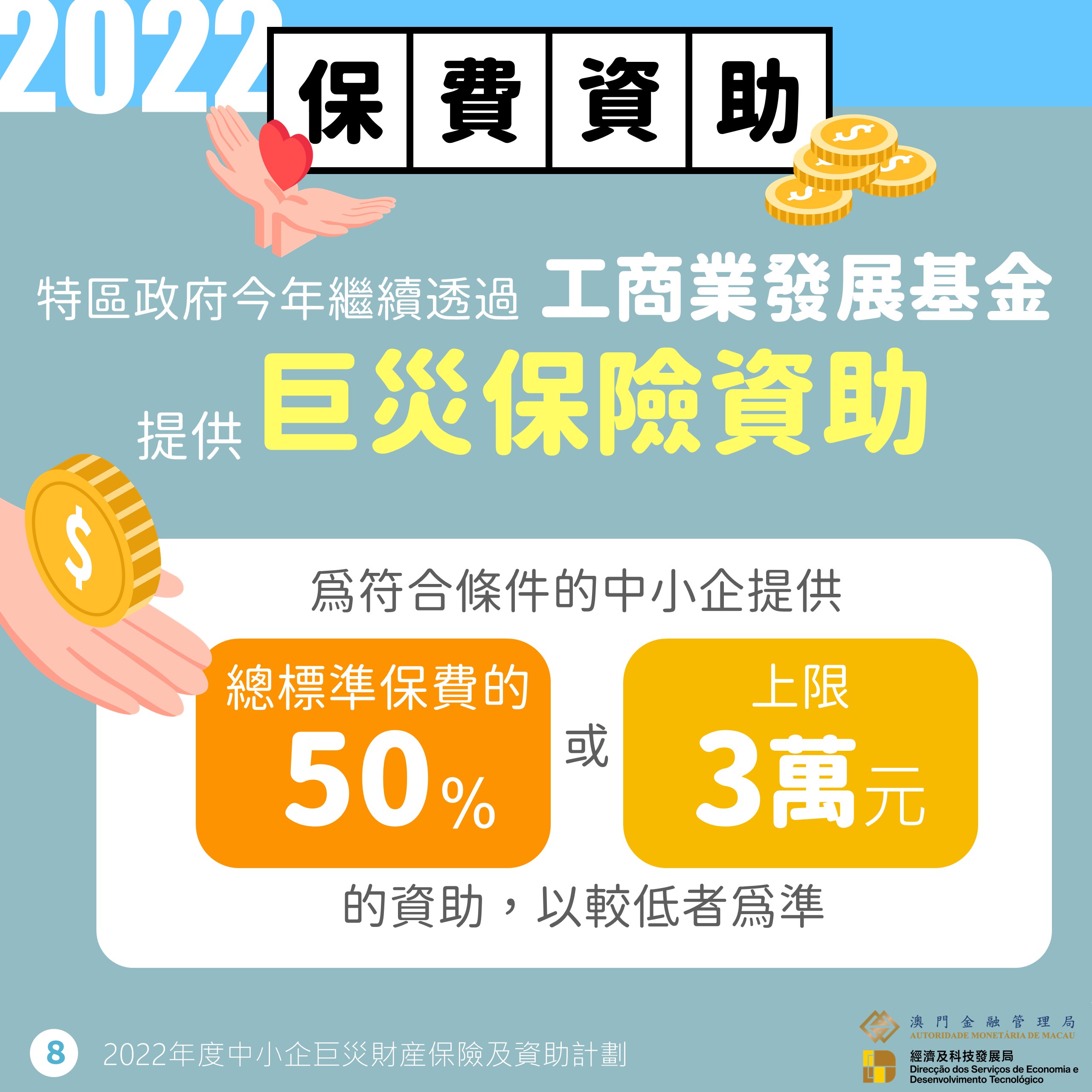 特區政府繼續透過“工商業發展基金”,為符合條件的中小企提供總標準保費的50%,或上限3萬元(以較低者為準)的“巨災保險資助”,以提高中小企的投保意願,並減輕其經濟負擔。保險公司可代收及轉交資助計劃申請文件,方便商戶“一站式”完成購買巨災保險及申請資助的手續。考慮到災害發生後商戶的緊急情況,保險公司並將繼續提供快速理賠服務。