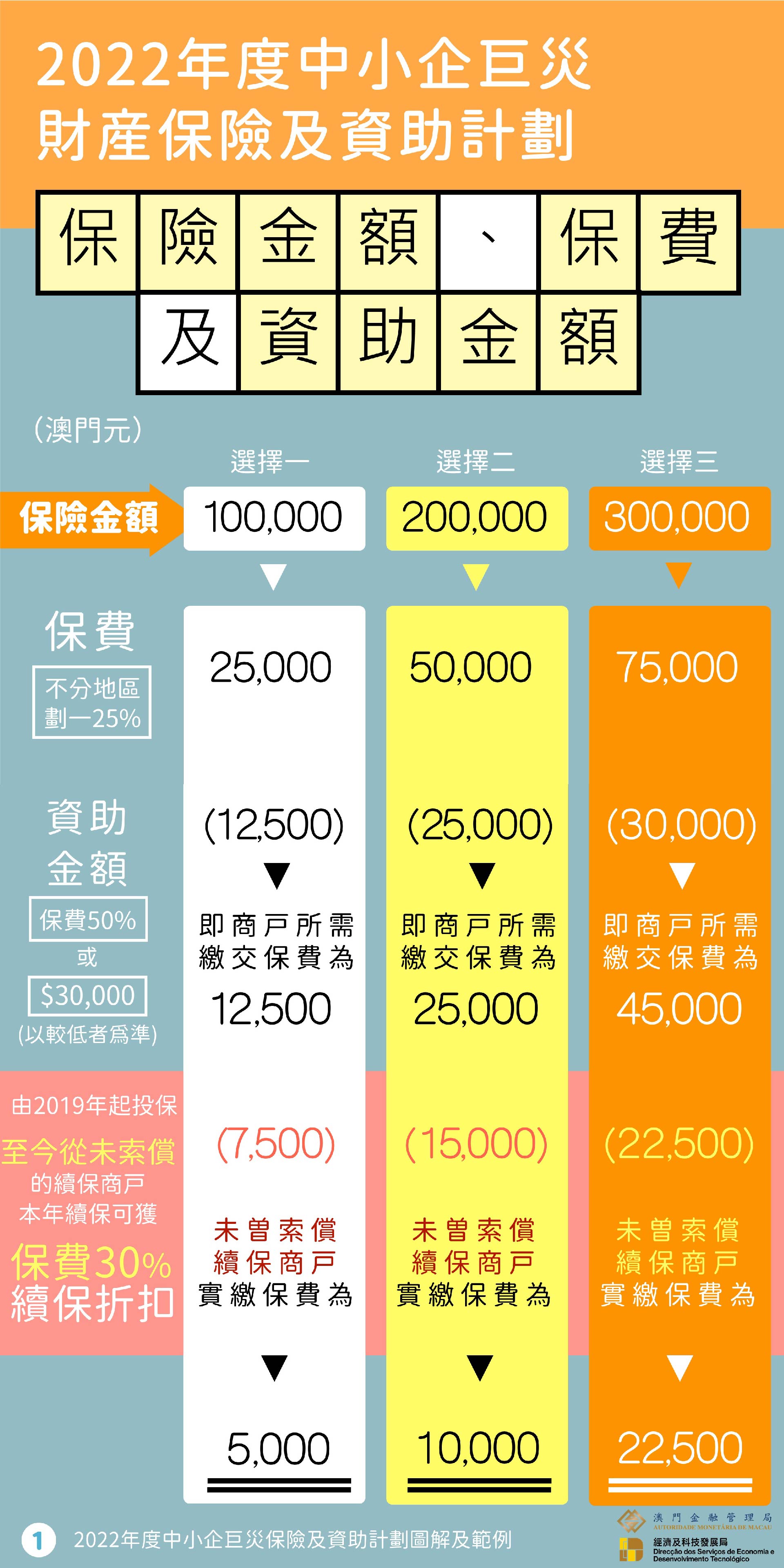 中小企可透過參與的五間本地保險公司,為每一營業場所投保一份巨災保險,保險金額可選擇10萬(澳門元,下同)、20萬或30萬,對應標準保費為25,000、50,000及75,000;未曾索償的續保商戶可繼續享有保費折扣,第一年續保有20%的折扣優惠,第二年為25%、第三年為30%、第四年或以上為35%。希望鼓勵商戶能持續投保,以管理自身風險。