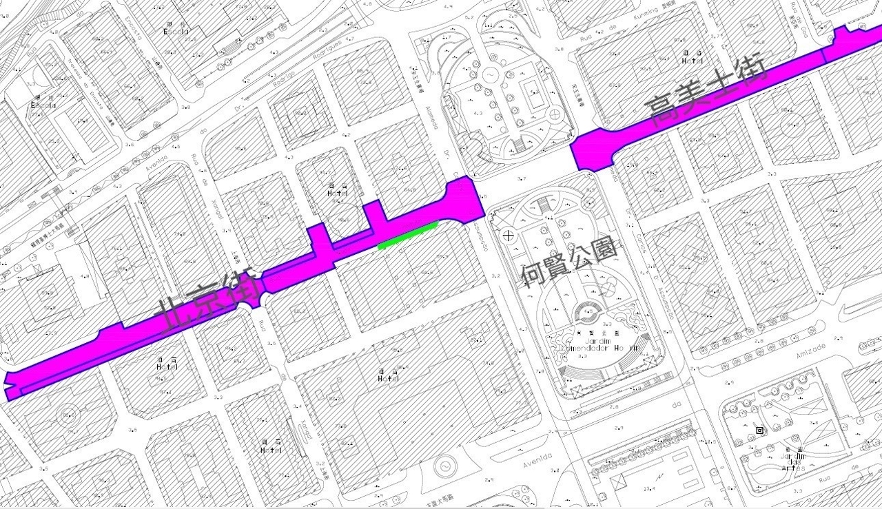 北京街與高美士街車流繁忙,有大量重型車輛行駛,有關路段之瀝青路面已有不同程度損毁及起伏不平的情況,對駕駛者構成危險。市政署因應專營公司將於相關路段範圍鋪設管線,為減少日後重複開挖的機會,於3月起協調各專營公司一併施工,包括進行路面重鋪及更換部分渠道。按工程進度,將由6月20日起於北京街與高美士街行車道分段重鋪,主要刮除舊有路面並以瀝青混凝土鋪設,部分泊車位則更換為鋼筋混凝土鋪設,以增加行車路面的耐用性。