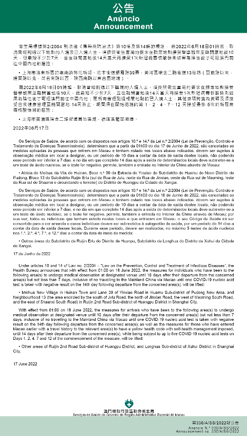 新型冠狀病毒感染應變協調中心(下稱應變協調中心)宣佈,因應內地的疫情變化,衛生局根據第2/2004號法律《傳染病防治法》第10條和第14條的規定,自2022年6月18日凌晨1時起,所有曾經到過以下區域的入境人士,須按照衛生當局的要求在指定地點接受醫學觀察至離開當地後10天,但最短不少於7天,並在離開當地後14天當天再接受1次新冠病毒核酸檢測結果為陰性後,才可經澳門前往中國內地;而所有曾經到過相關地點的已入境人士,其健康碼將變為黃碼及須接受自我健康管理至離開當地 14 天為止,期間須在開始措施的第 1、2、4、7、12天接受最多5次的新冠病毒核酸檢測:上海市嘉定區安亭鎮。