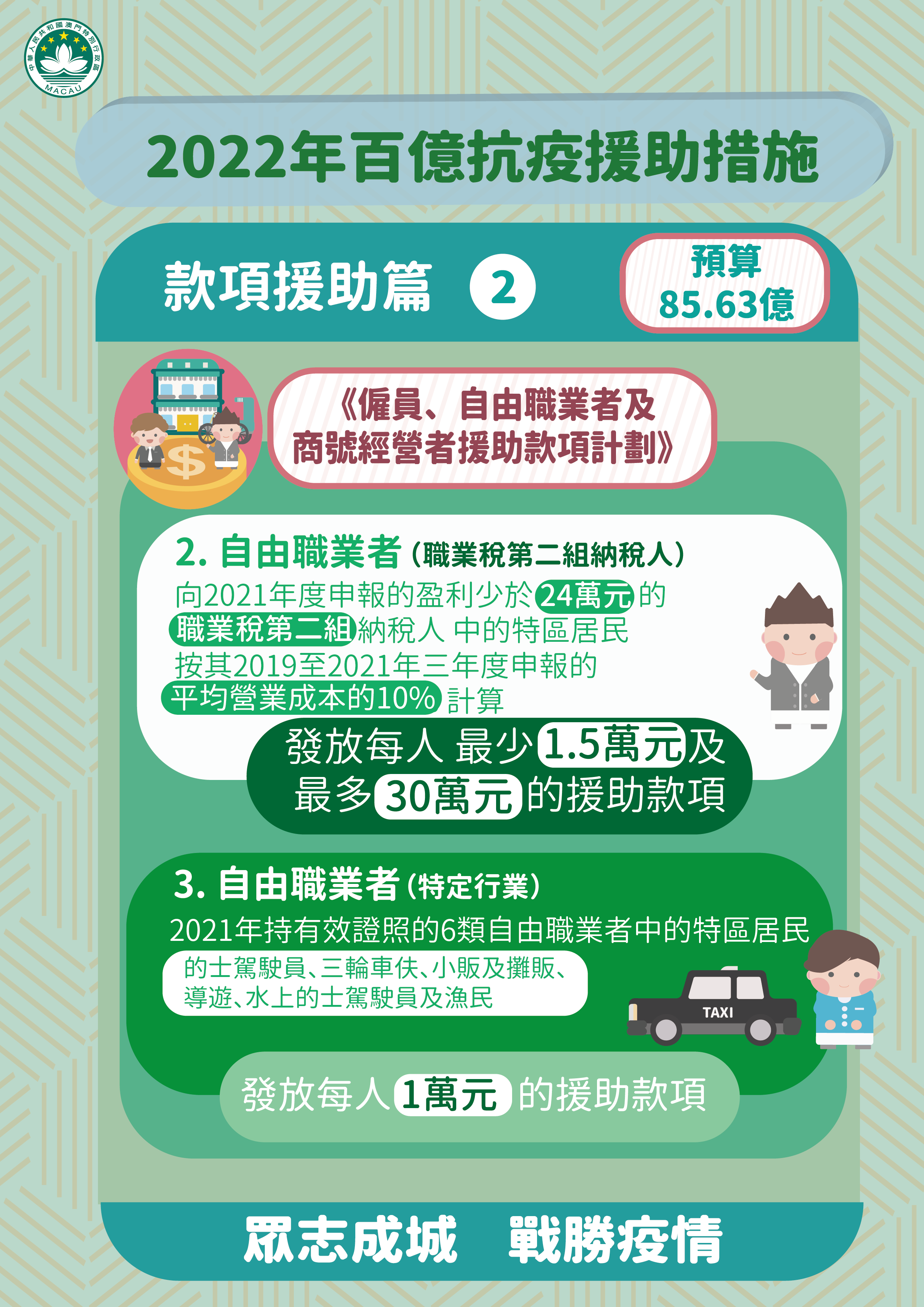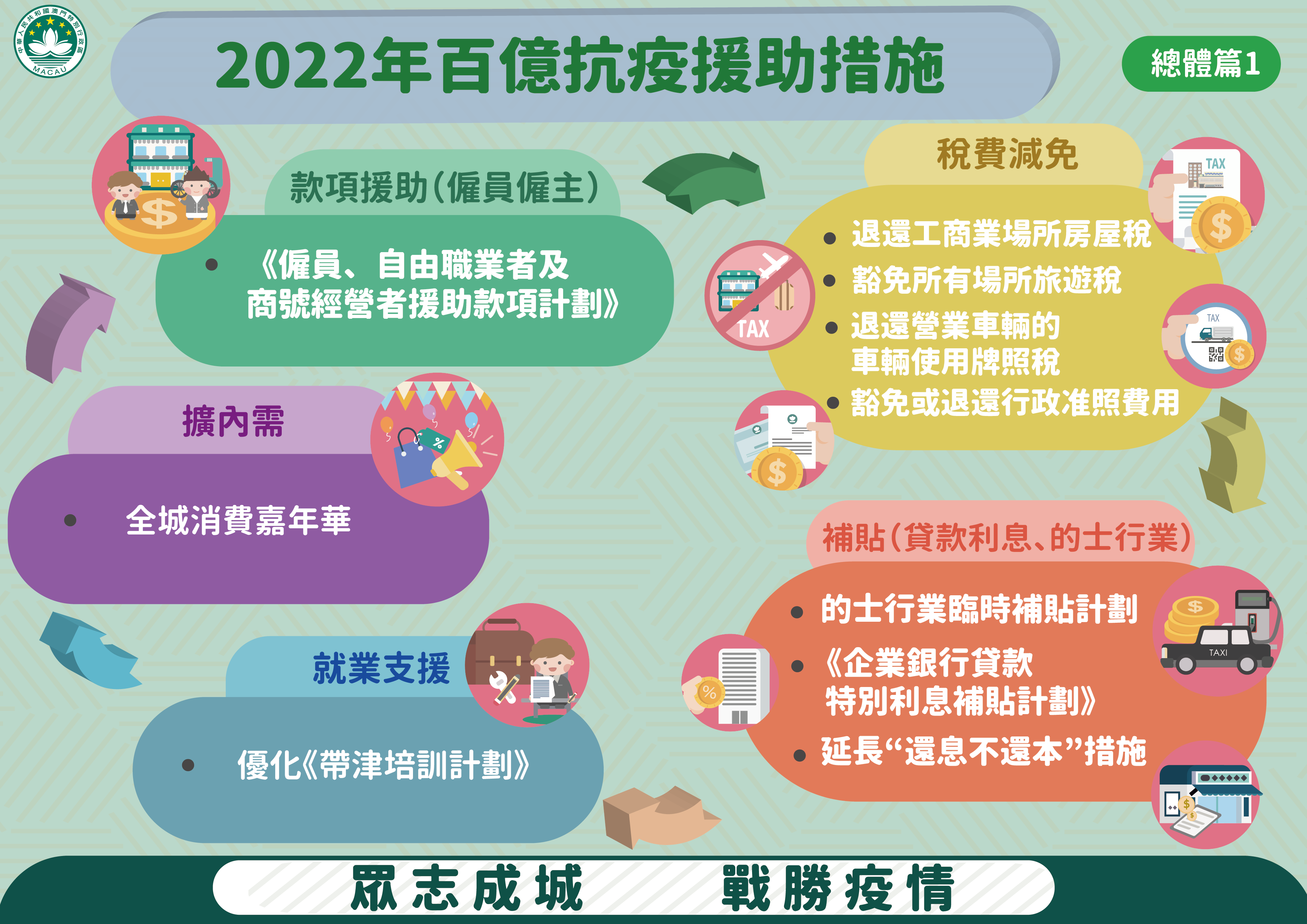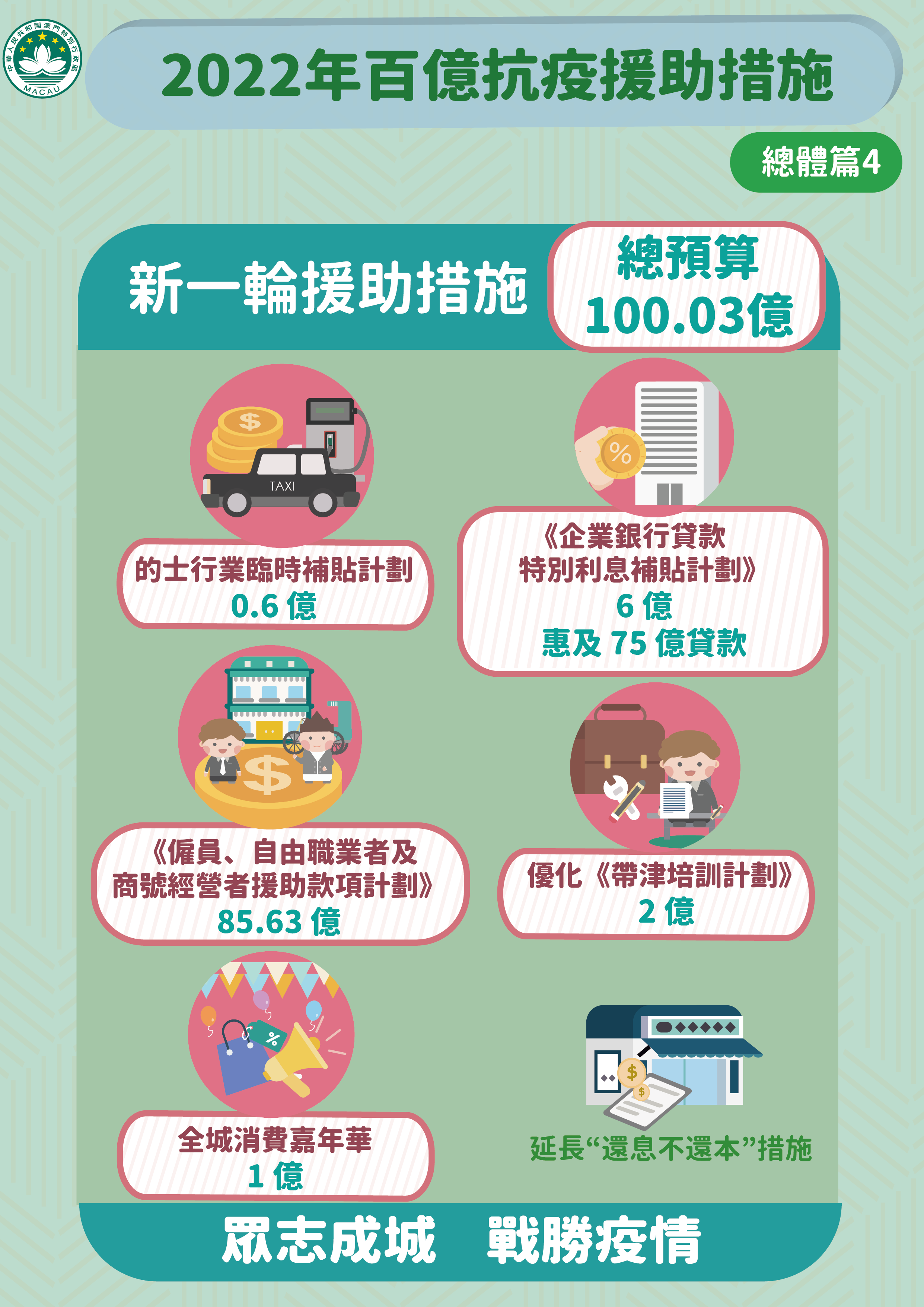 特區政府因應本澳再面對疫情突發情況,迅速推出《2022年百億抗疫援助措施》。新一輪經援措施涵蓋5個方面共9項措施,包括:款項援助、就業支援、稅費減免、補貼及擴內需,預算支出超過100億澳門元。