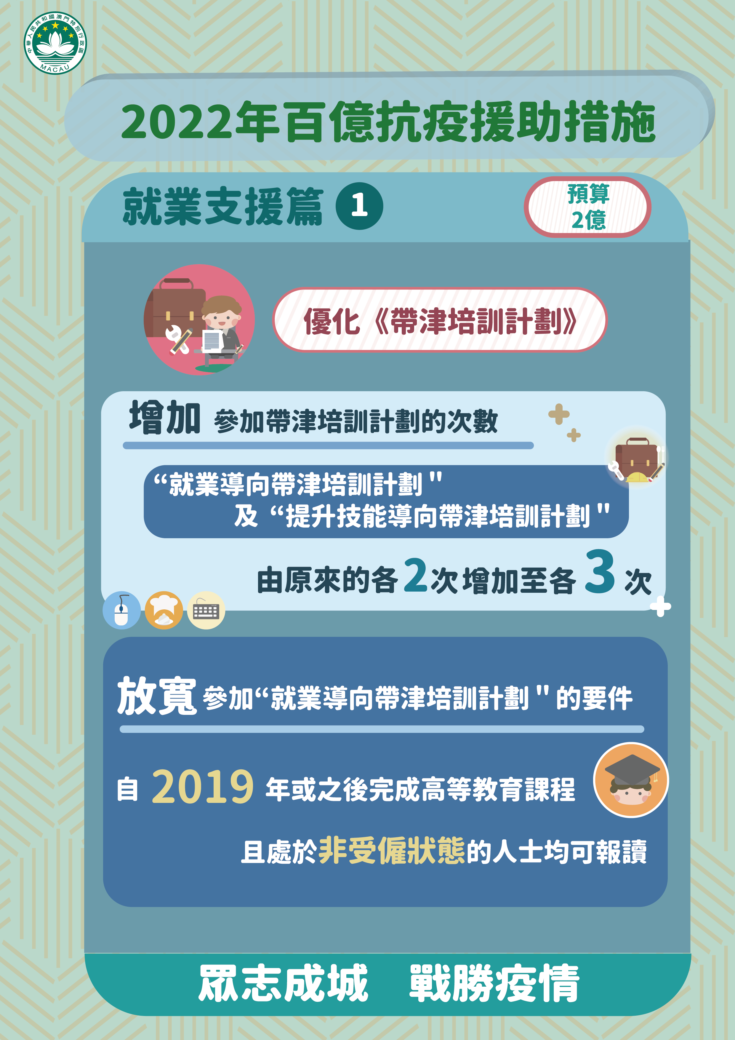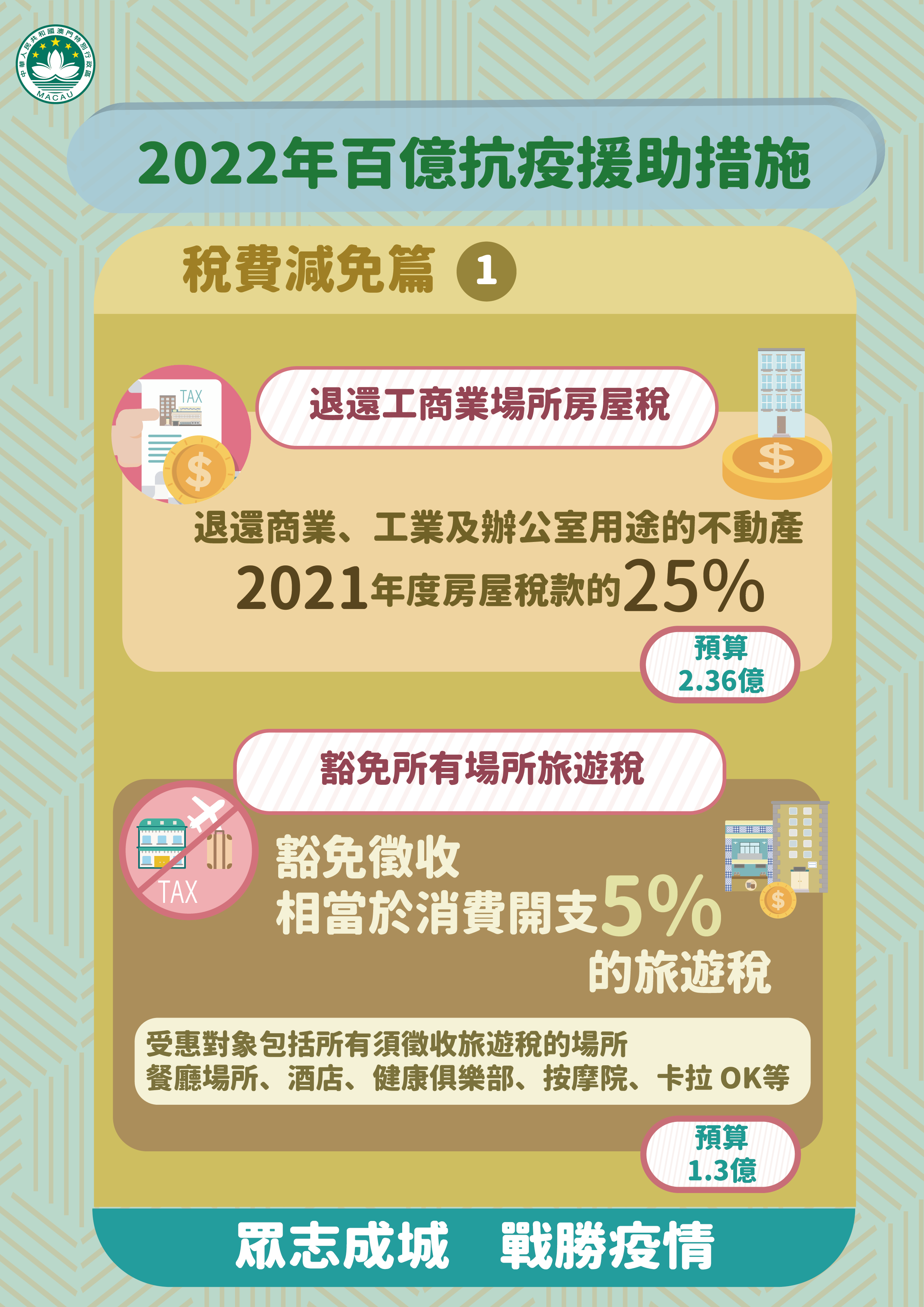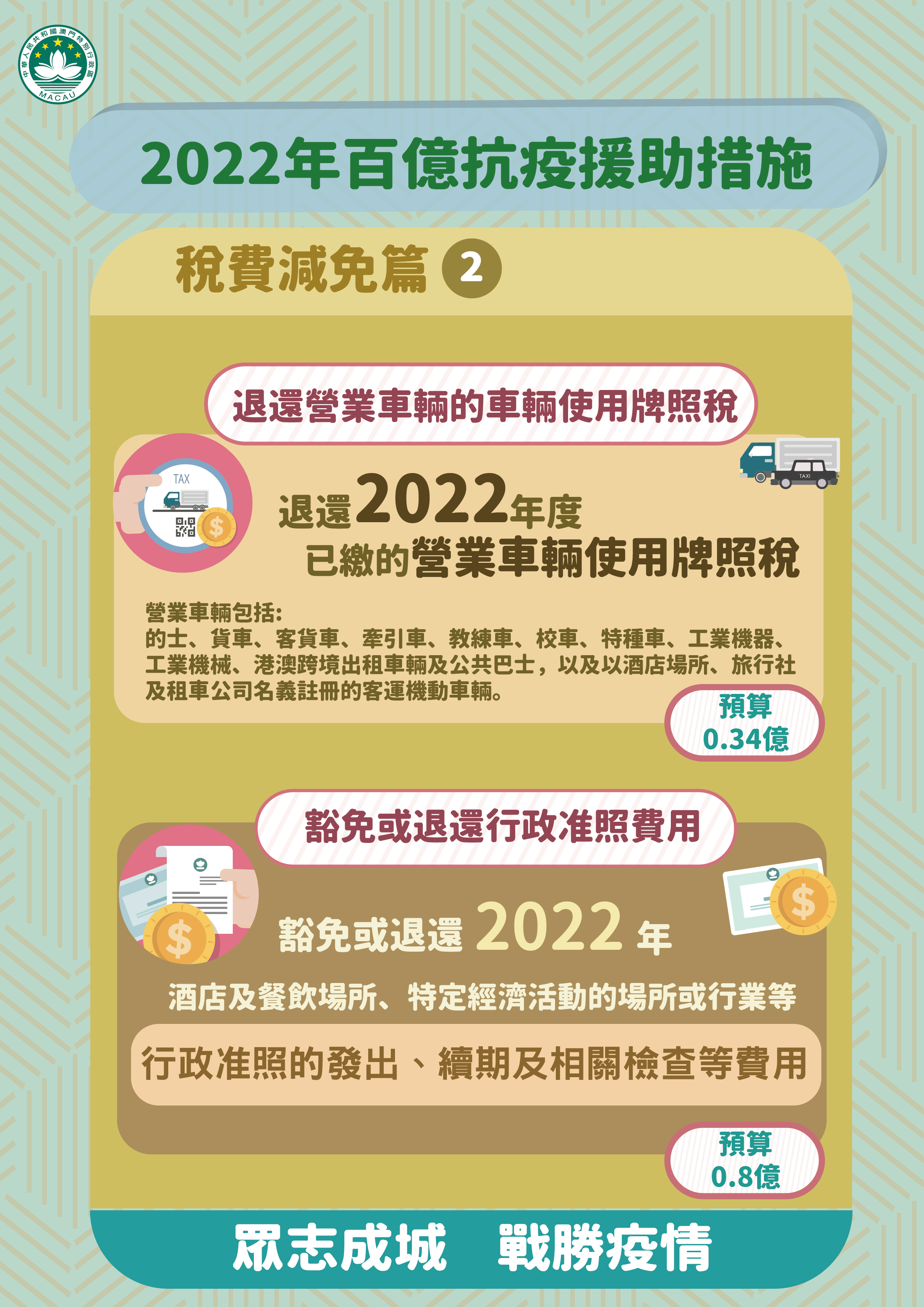 特區政府因應本澳再面對疫情突發情況,迅速推出《2022年百億抗疫援助措施》。新一輪經援措施涵蓋5個方面共9項措施,包括:款項援助、就業支援、稅費減免、補貼及擴內需,預算支出超過100億澳門元。