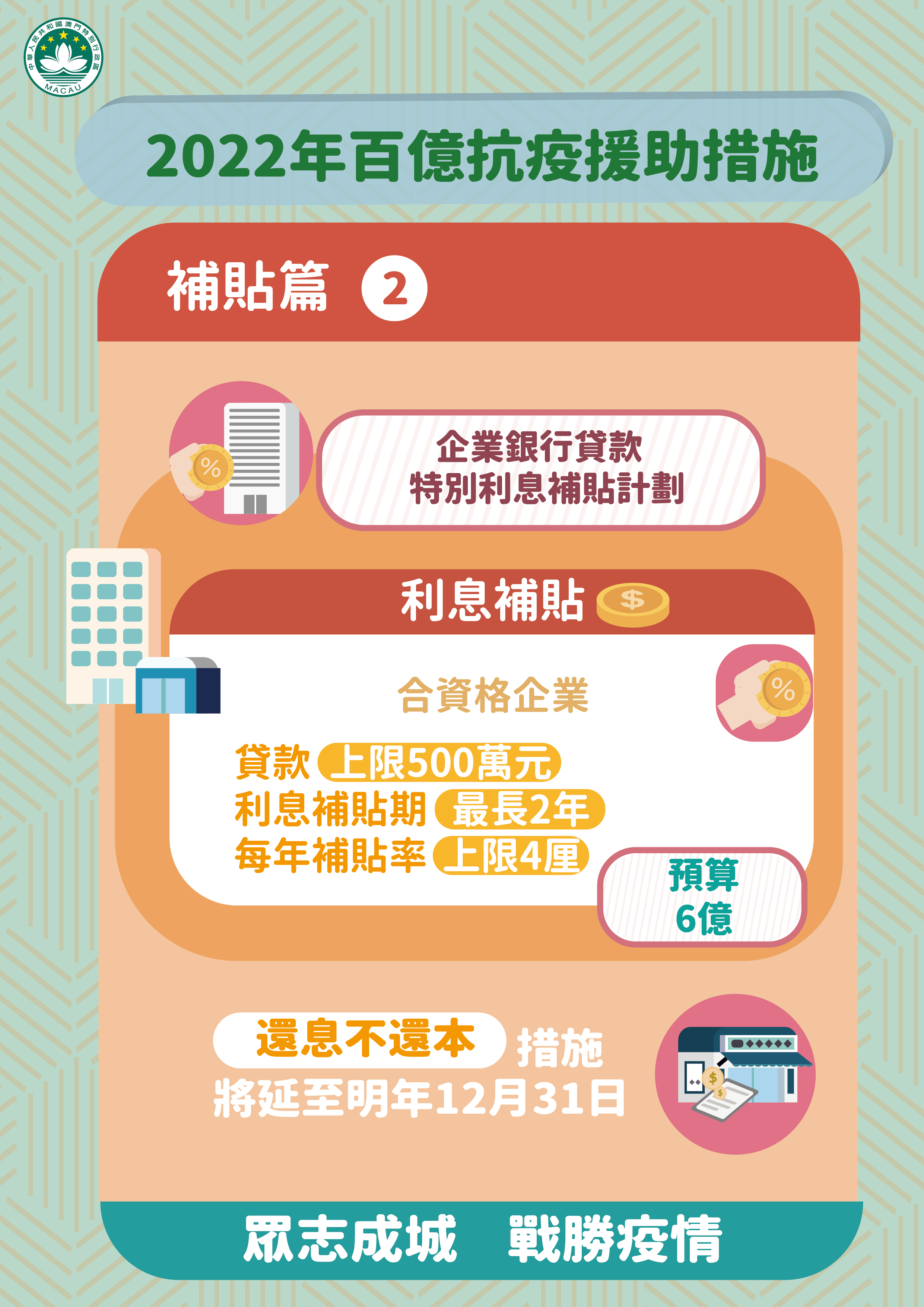 (1) 對合資格企業發放貸款上限為500萬澳門元的利息補貼,利息補貼期最長2年,每年補貼率上限為4厘。
