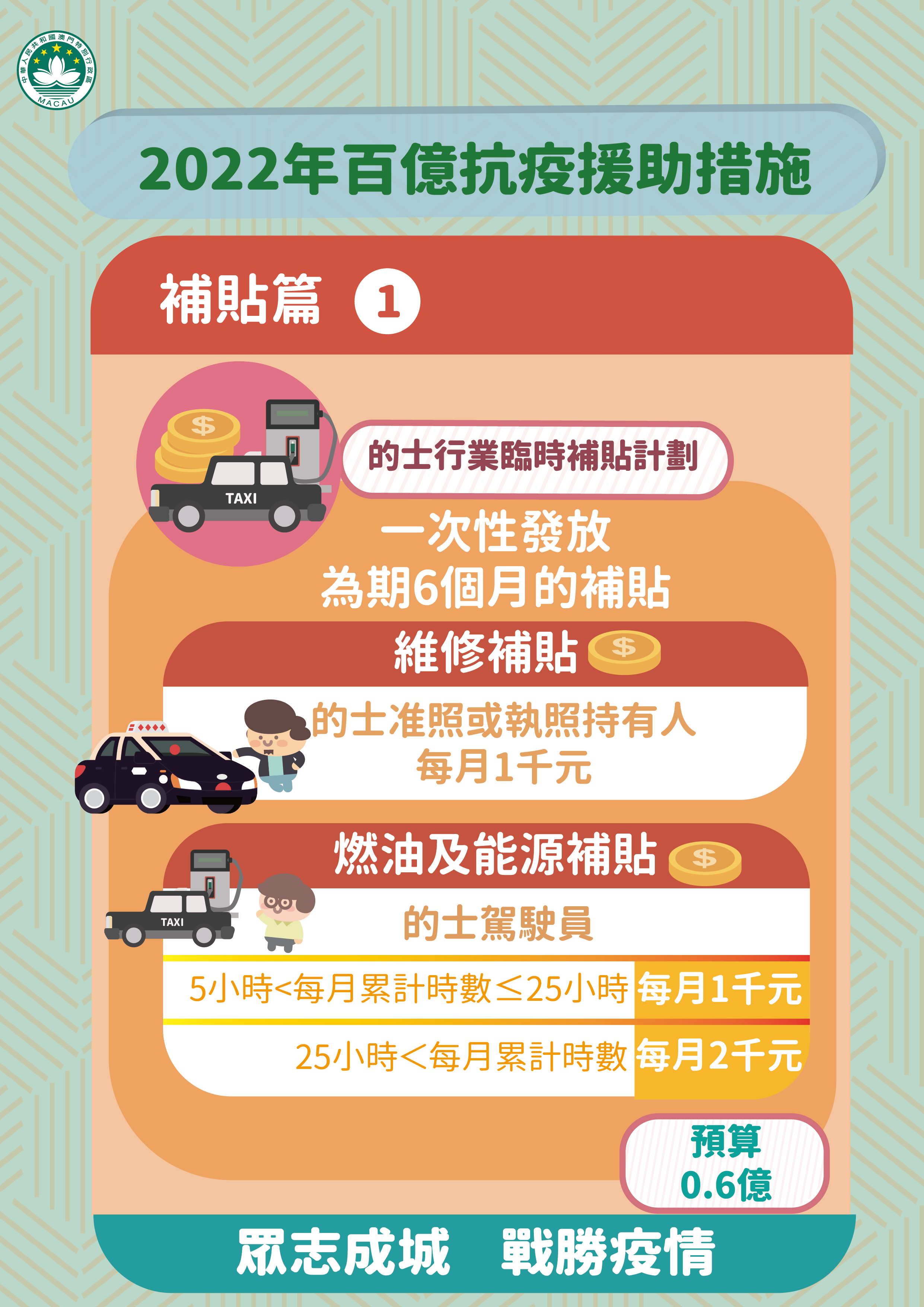 (1) 向的士准照或執照持有人一次性發放為期 6 個月合共6千澳門元維修補貼。