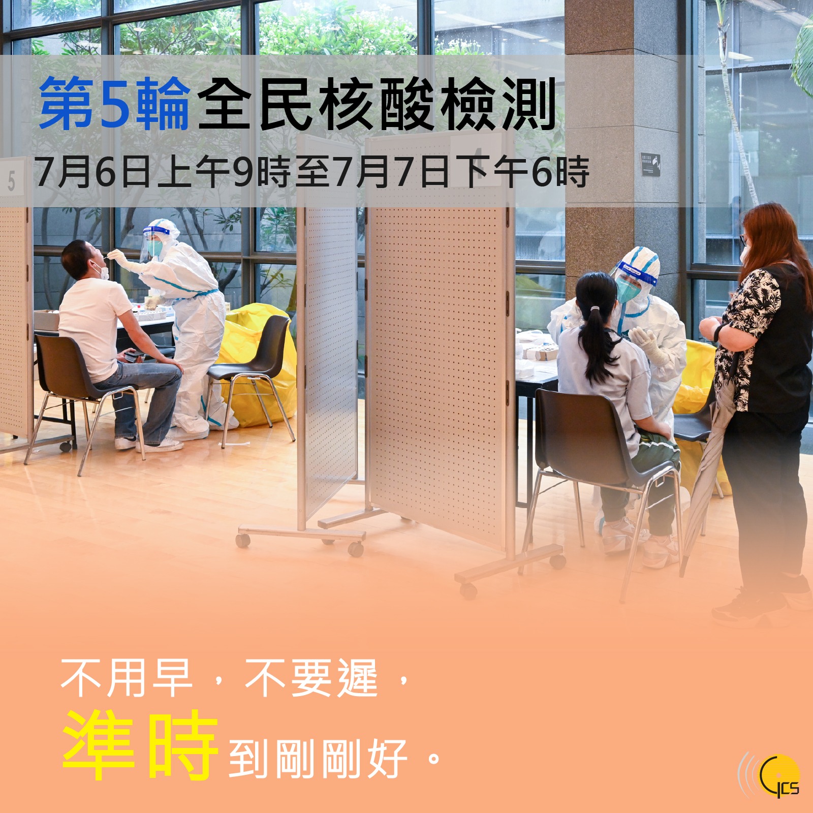 第五輪全民核酸檢測由7月6日上午9時至7月7日下午6時展開。不用早,不要遲,準時到剛剛好。
