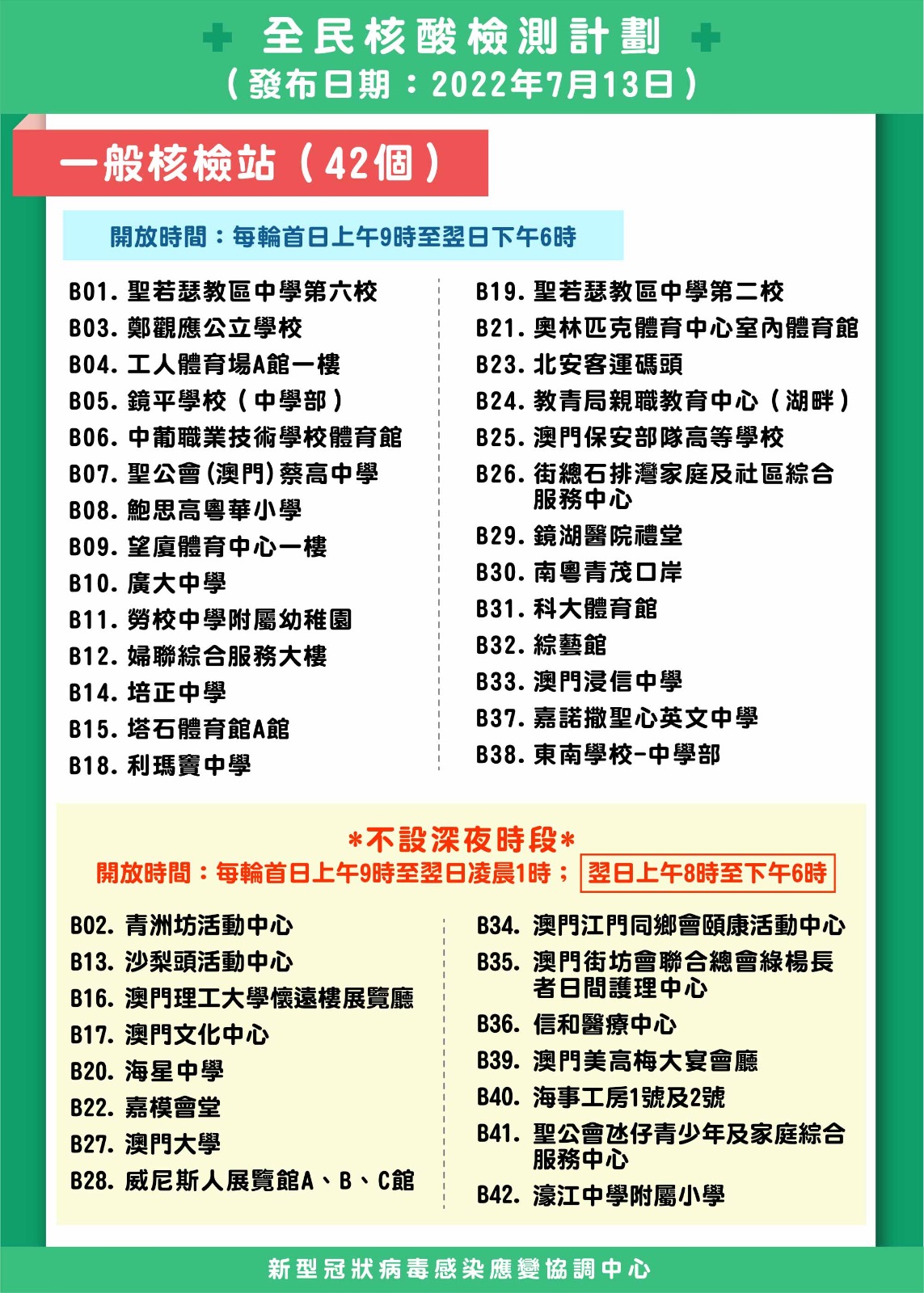 另有4個一般站,包括:B20海星中學、B28 威尼斯人展覽館A、B、C館、B35 澳門街坊會聯合總會綠楊長者日間護理中心和B39 澳門美高梅大宴會廳,連同上一輪不設深夜時段的11個一般站(詳見表格),開放時間統一調整為7月14日上午9時至7月15日凌晨1時,7月15日上午8時至下午6時;其他一般站開放時間維持不變。