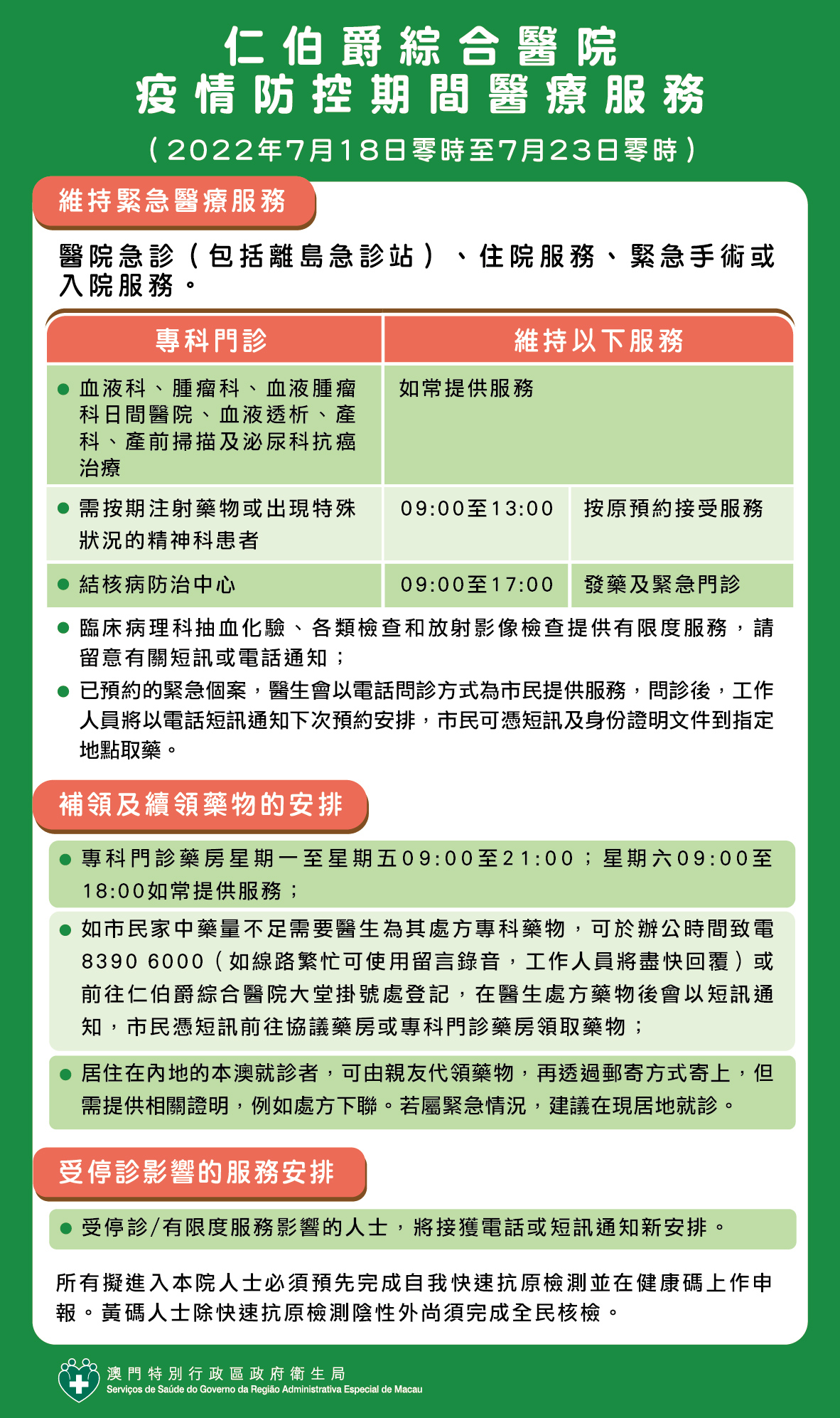 為防止新型冠狀病毒在澳門的傳播風險,自2022年7月18日零時至7月23日零時,所有從事工商業活動的公司、實體及場所暫停營運。疫情防控期間,仁伯爵綜合醫院、衛生中心/站的醫療服務、補領及續領藥物等相關安排如下: