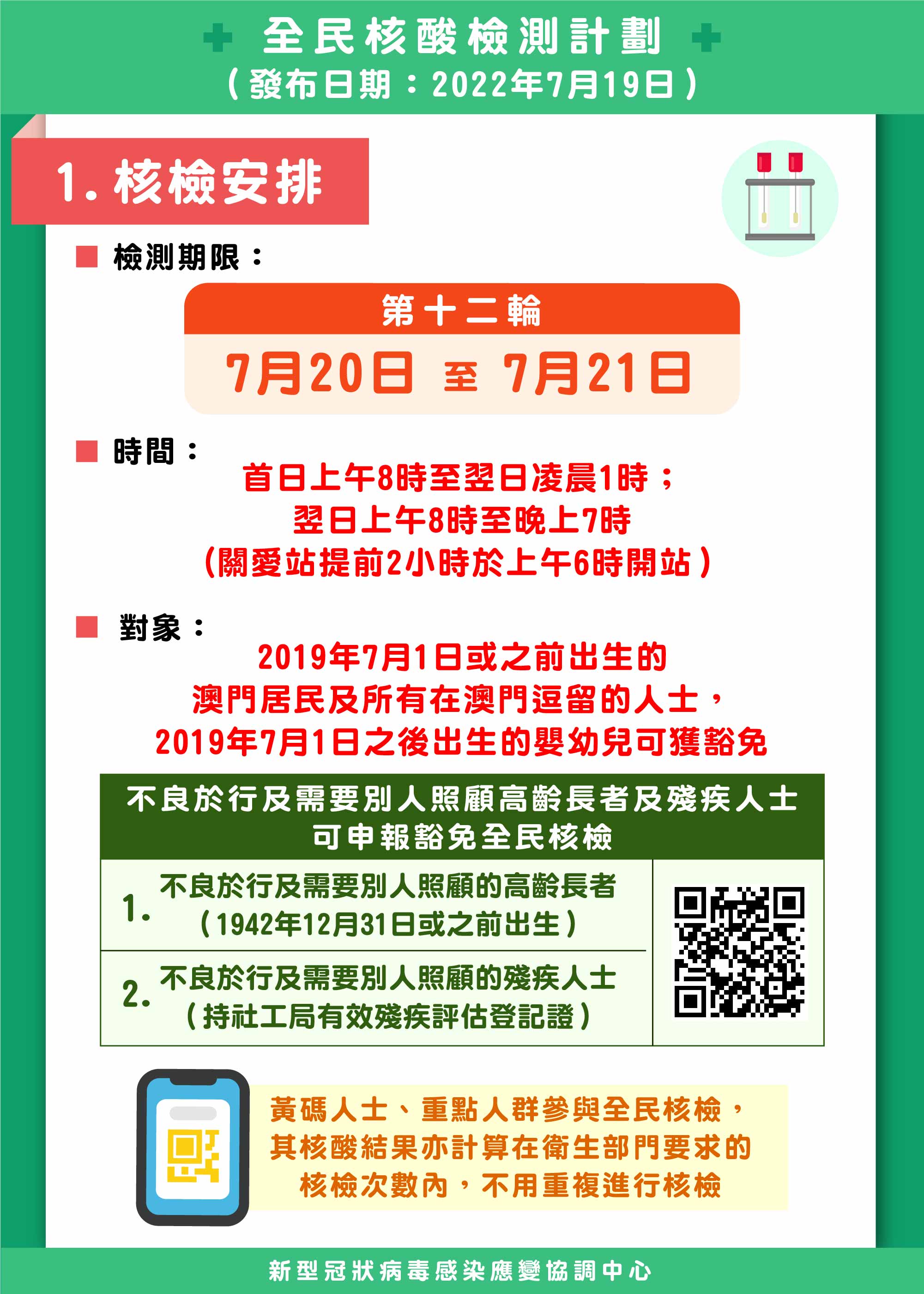 合資格高齡長者及殘疾人士可申報豁免全民核檢詳情另見社會工作局新聞稿(https://www.gcs.gov.mo/detail/zh-hant/N22GQFiw1l?1)。